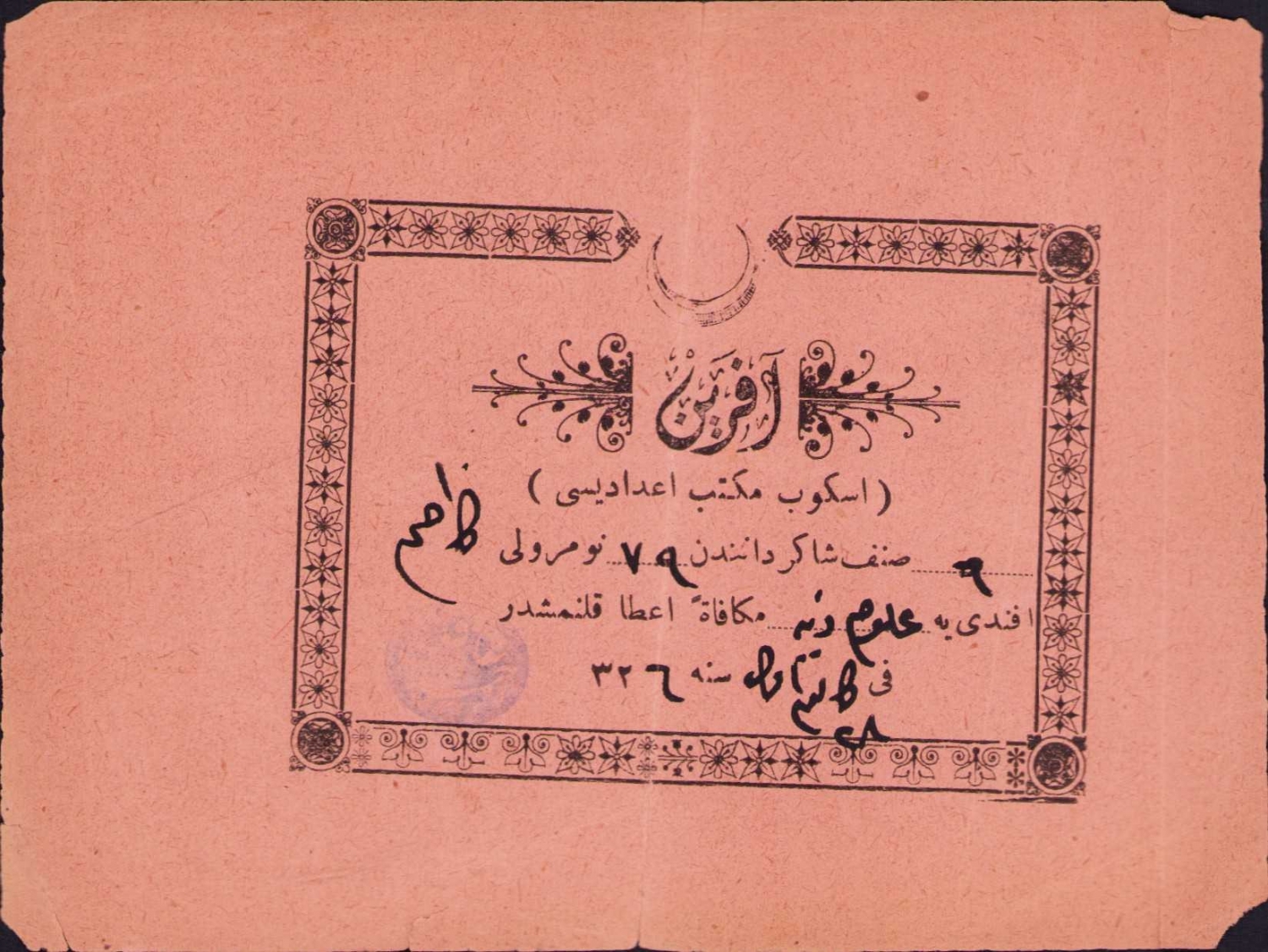 Osmanlıca Aferin, Üsküp Mekteb-i İdadisi, 1326 tarihli, 13x10 cm