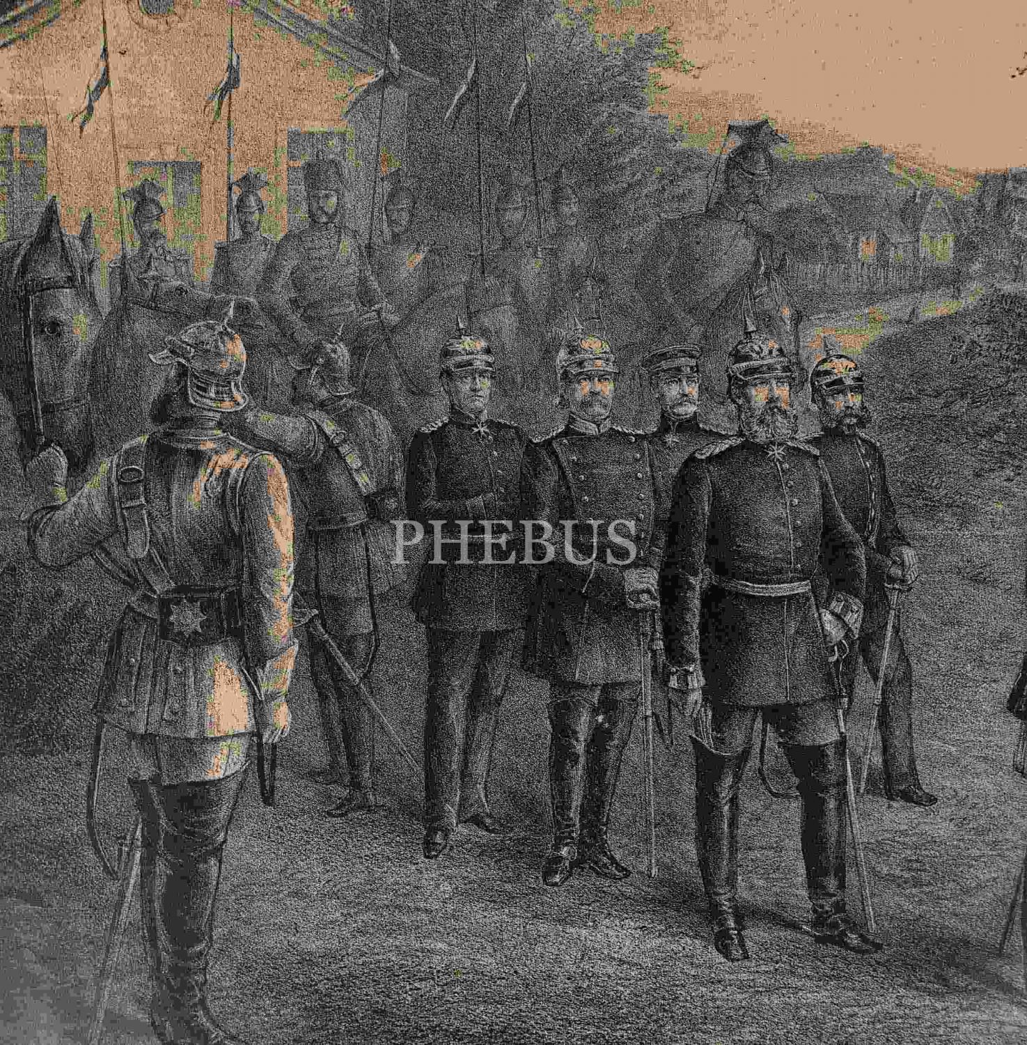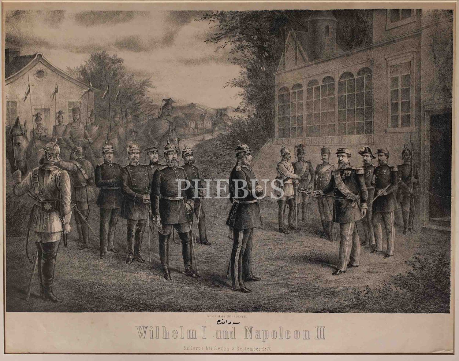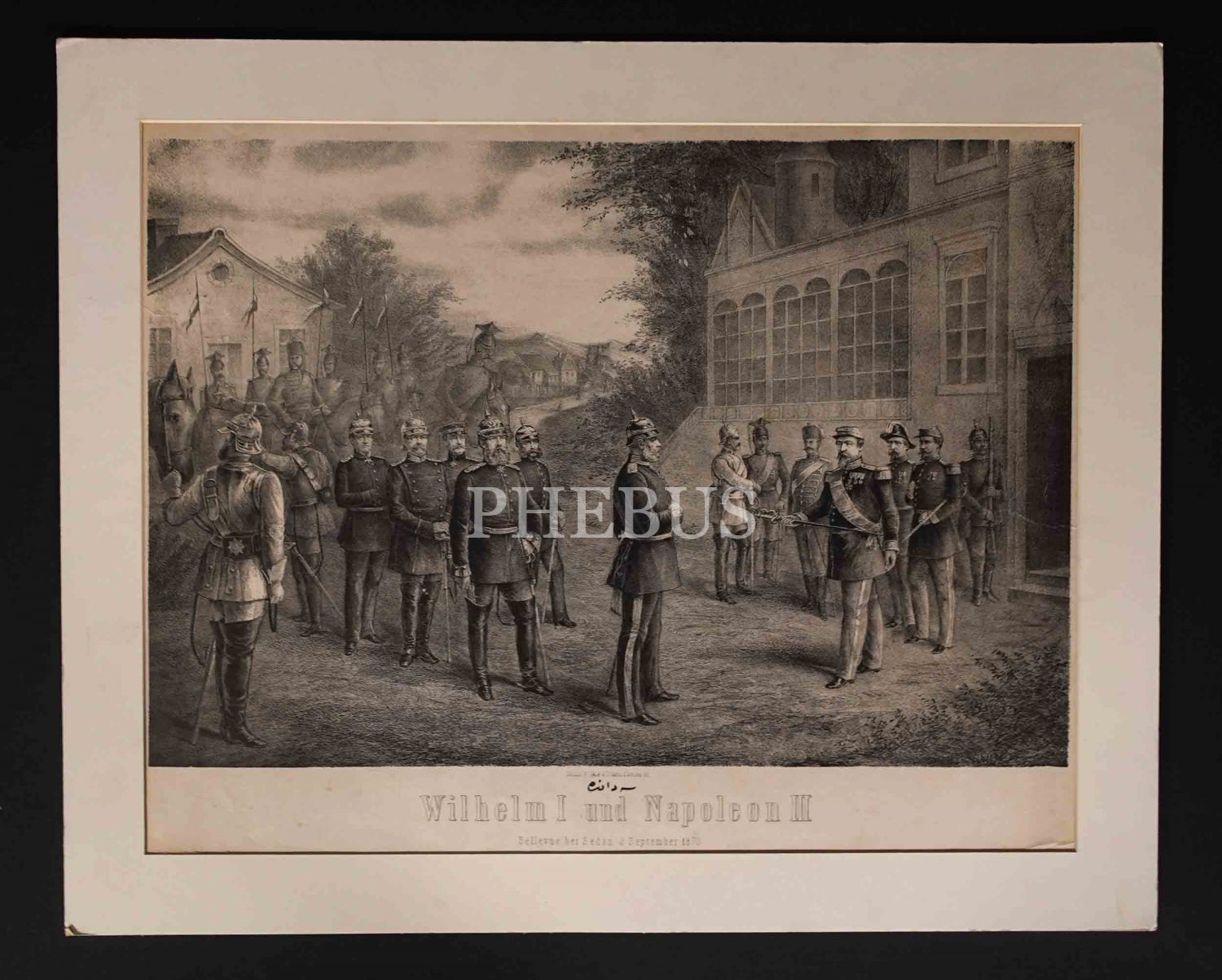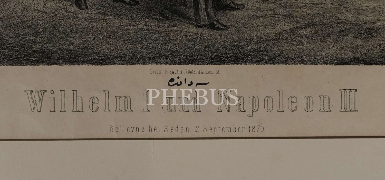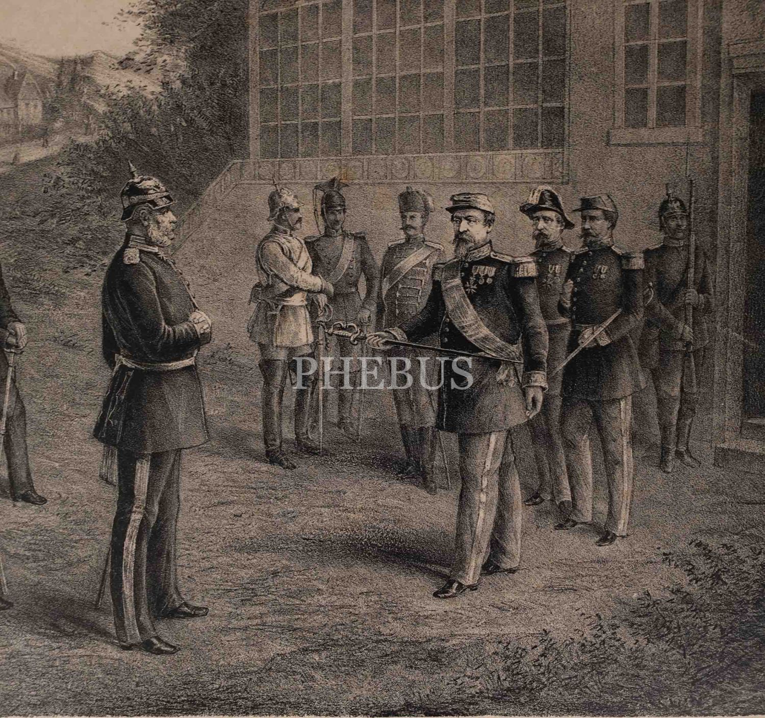 Sedan Muharebesi sonrası kılıcını Alman İmparatoru I. Wilhelm´e teslim eden Fransız İmparatoru III. Napoleon konulu Alman baskı gravür, F. Sala & Co., paspartusuyla birlikte 68x55 cm...