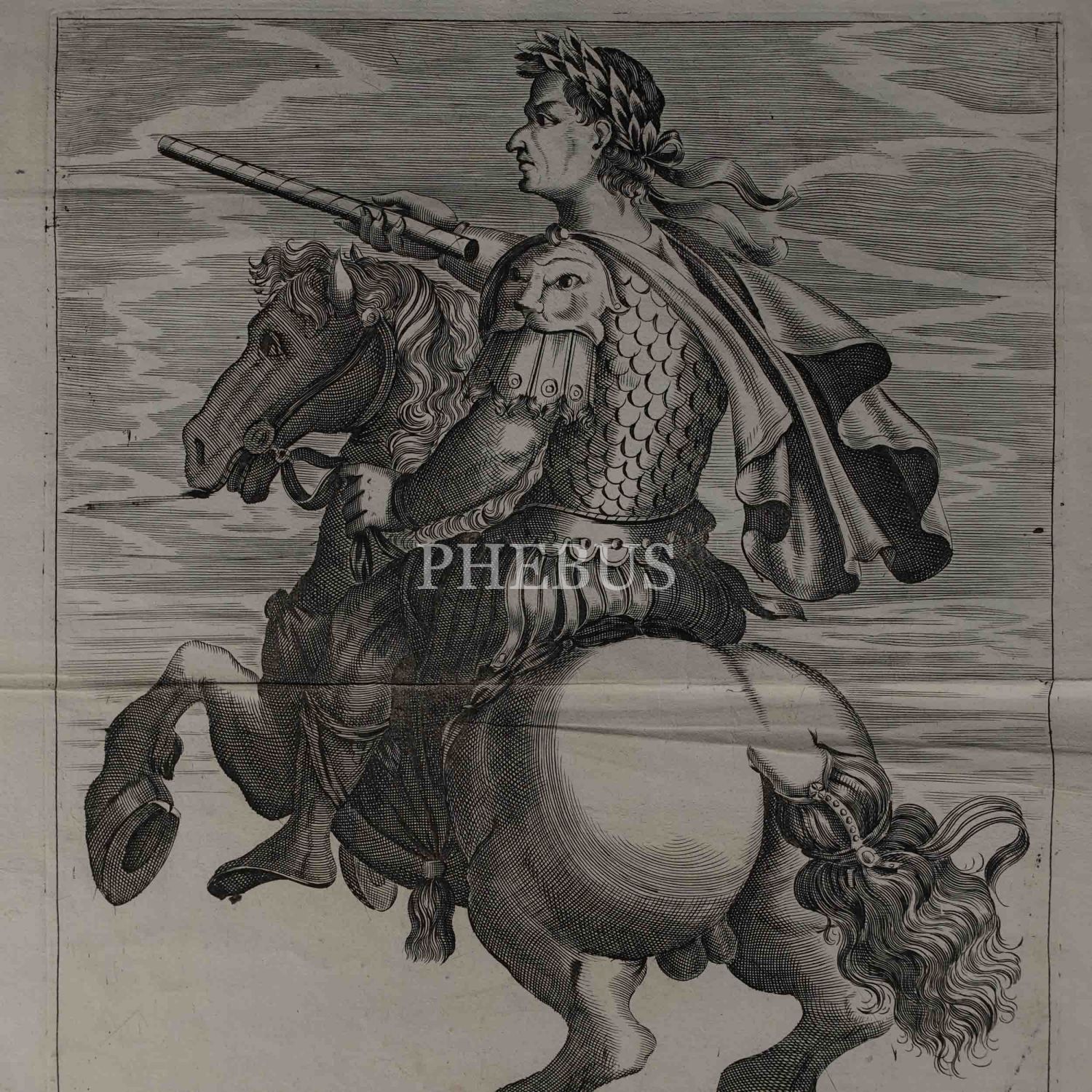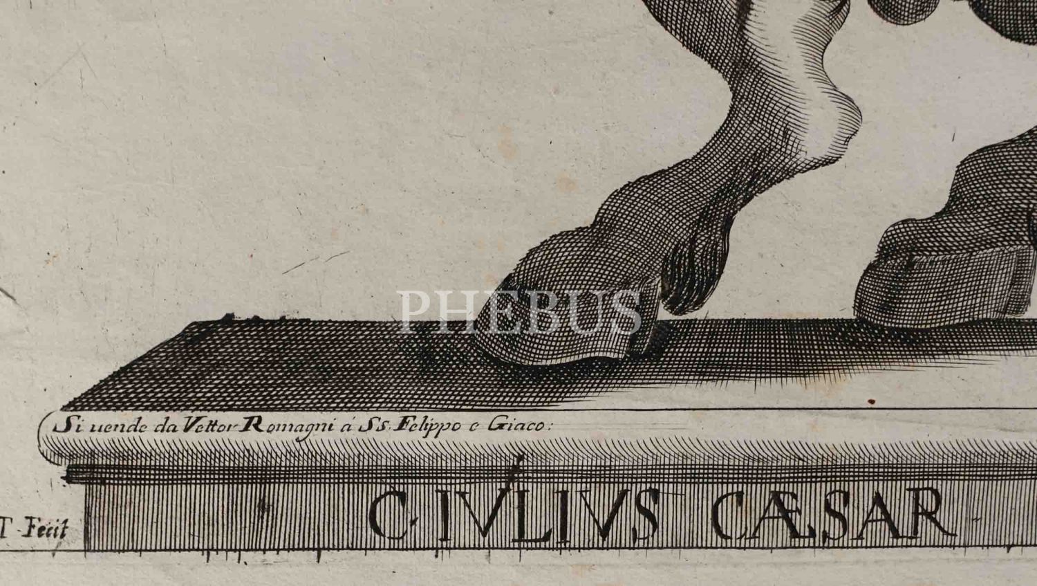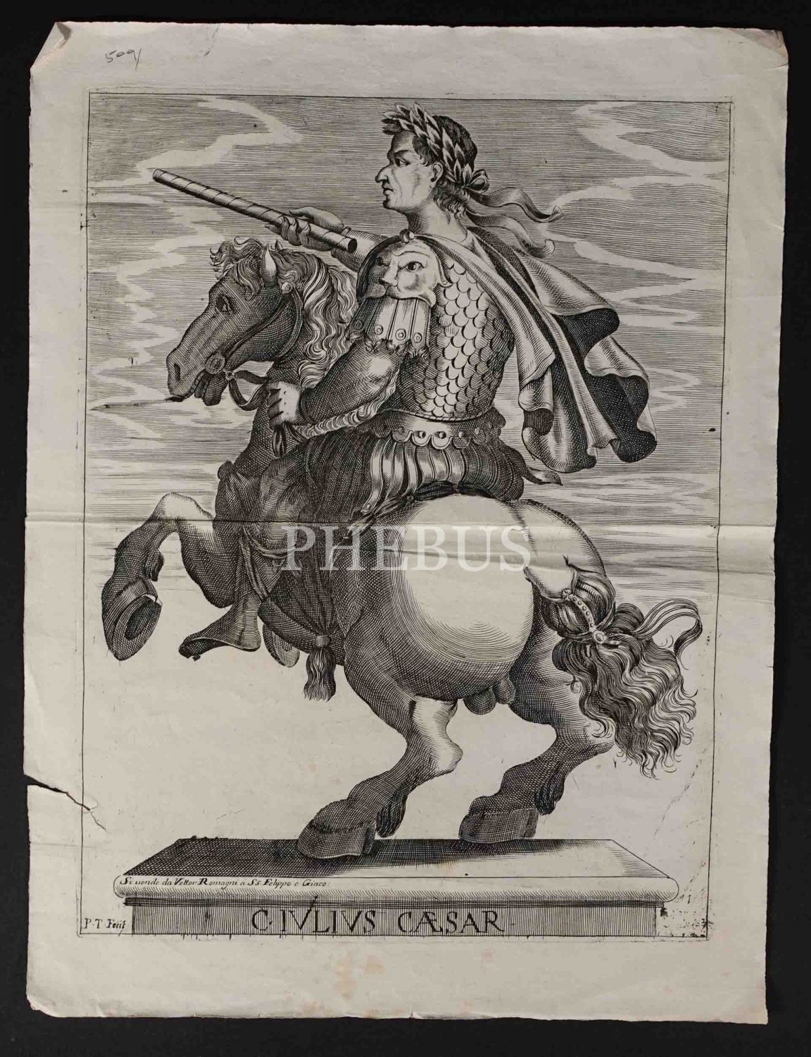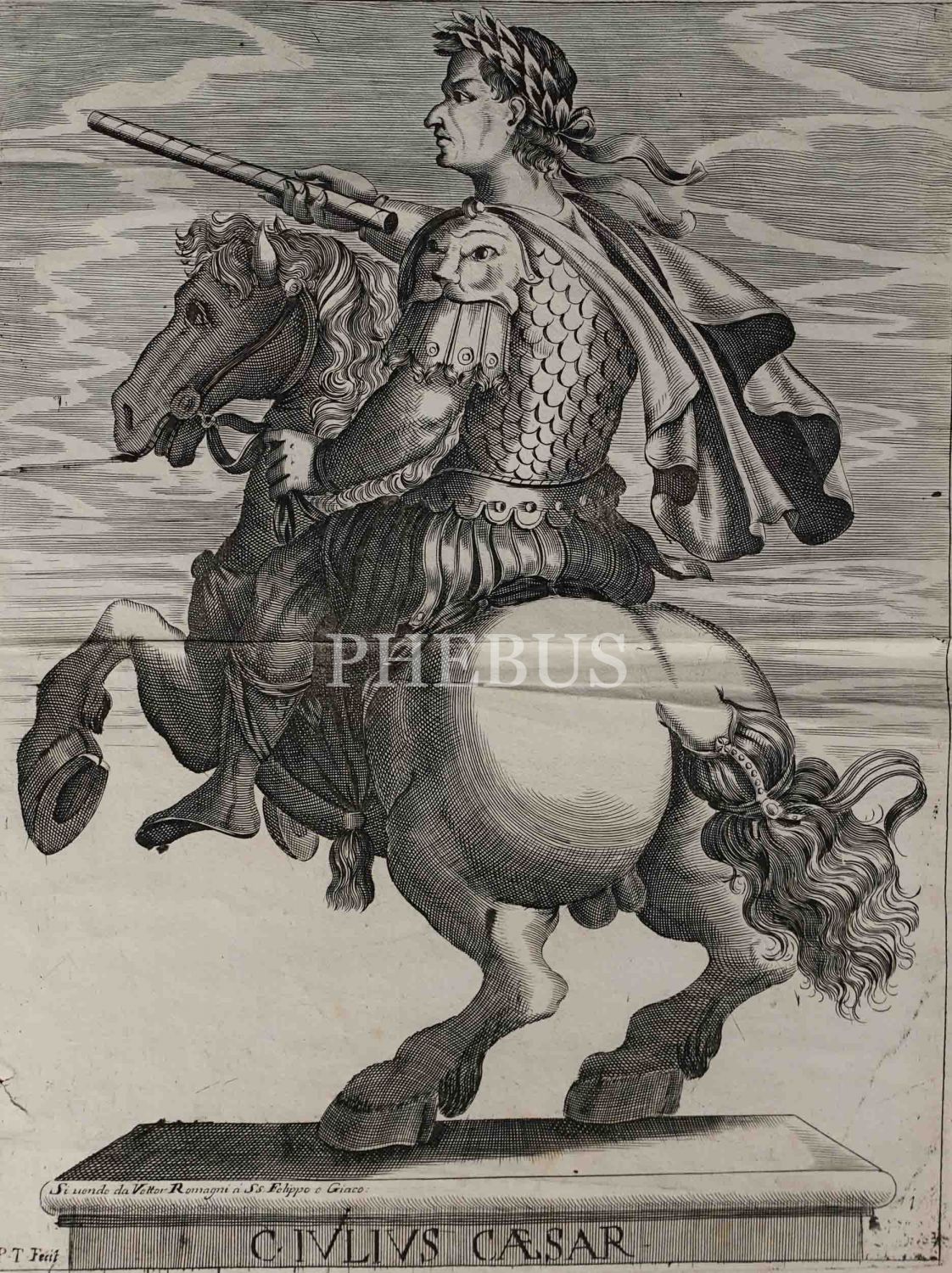 Roma İmparotorluğu - The Twelve Caesars serisinden 1754 tarihli gravür. "Si vende da Vettor Romagni a Ss. Felippo e Giaco. - P.T. Fecit" Bir kitabın içinden çıkma değil, müstakil olarak basılıp satılmış bakır baskı gravür. Sol kenarında 4 cm uzunluğunda bir yırtık mevcuttur.