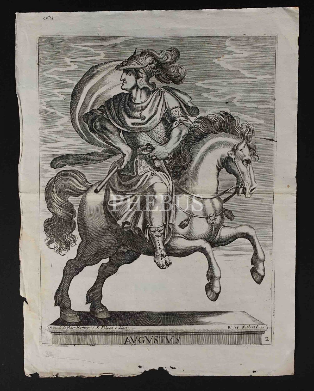 Roma İmparotorluğu - The Twelve Caesars serisinden 1754 tarihli gravür. "Si vende da Vettor Romagni a Ss. Felippo e Giaco. - P.T. Fecit" Bir kitabın içinden çıkma değil, müstakil olarak basılıp satılmış bakır baskı gravür. Sol kenarında 3 cm uzunluğunda bir yırtık mevcuttur.