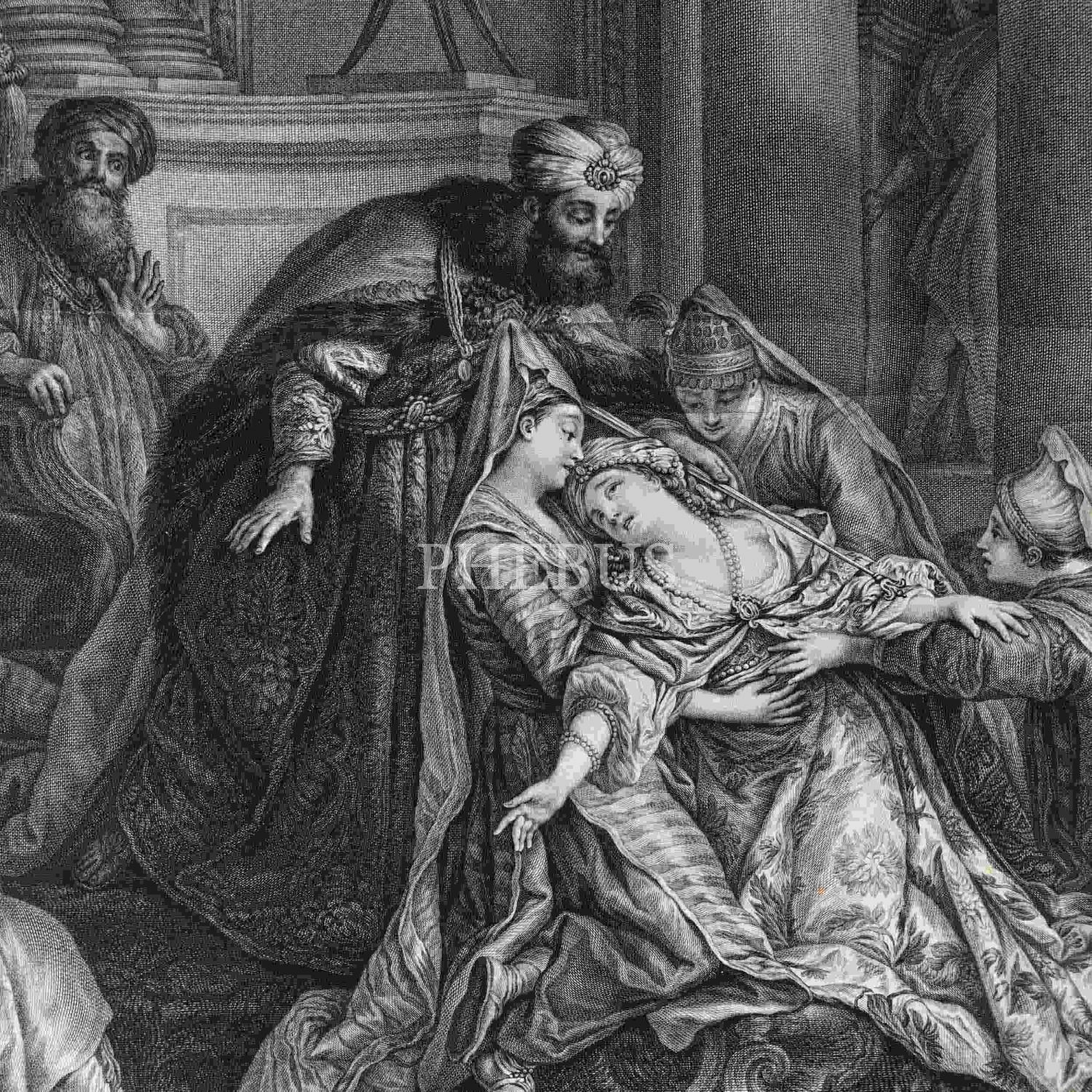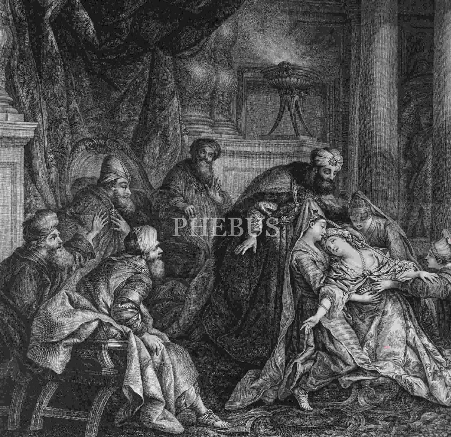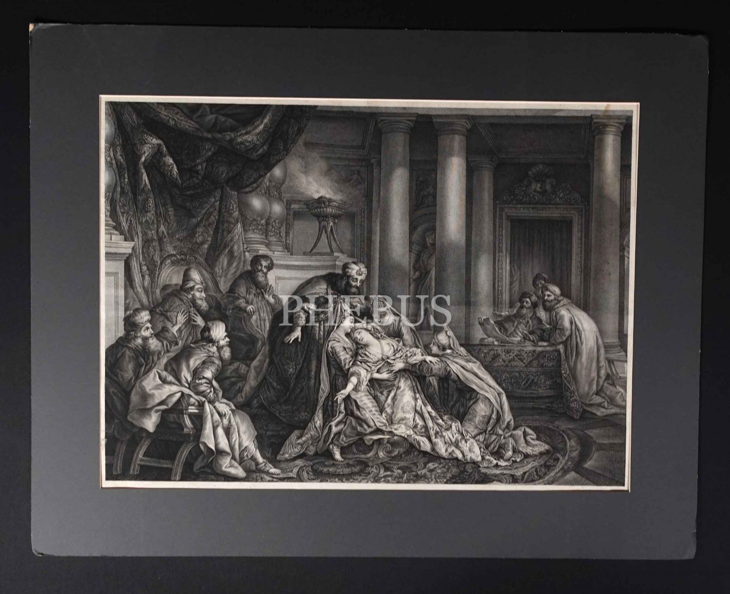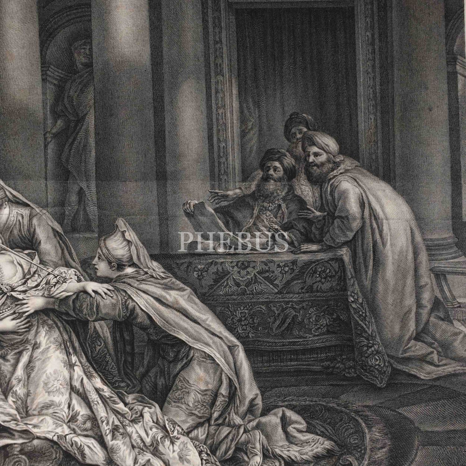 Fransız ressam Jean François de Troy´un (1679-1752) L´Evanouissement d´Esther (Ester´in Bayılması) isimli tablosundan oluşturulmuş gravür, paspartusuyla birlikte 77x60 cm...
