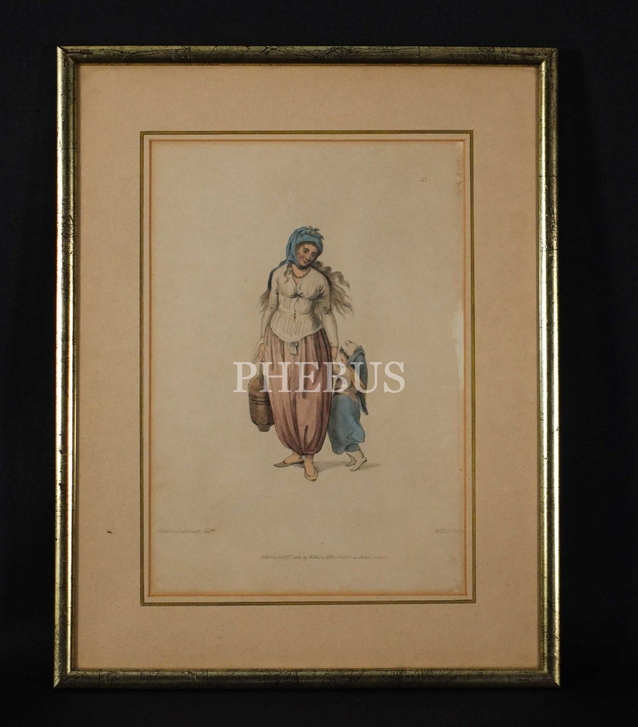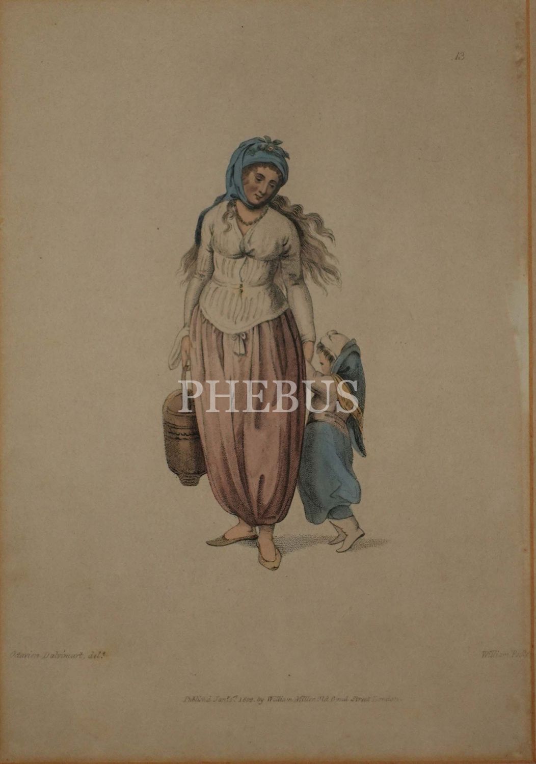Octavian Dalvimart´ın 1802 baskı "The Costume of Turkey" (Osmanlı Kostümleri) ismiyle Londra´da yayınlanan kıyafet albümünden elle renklendirilmiş "Marmara Adası´ndan bir Yunan kadını" (A Greek woman of the Island of Marmara) gravürü, çerçevesiyle birlikte 37x47 cm...
