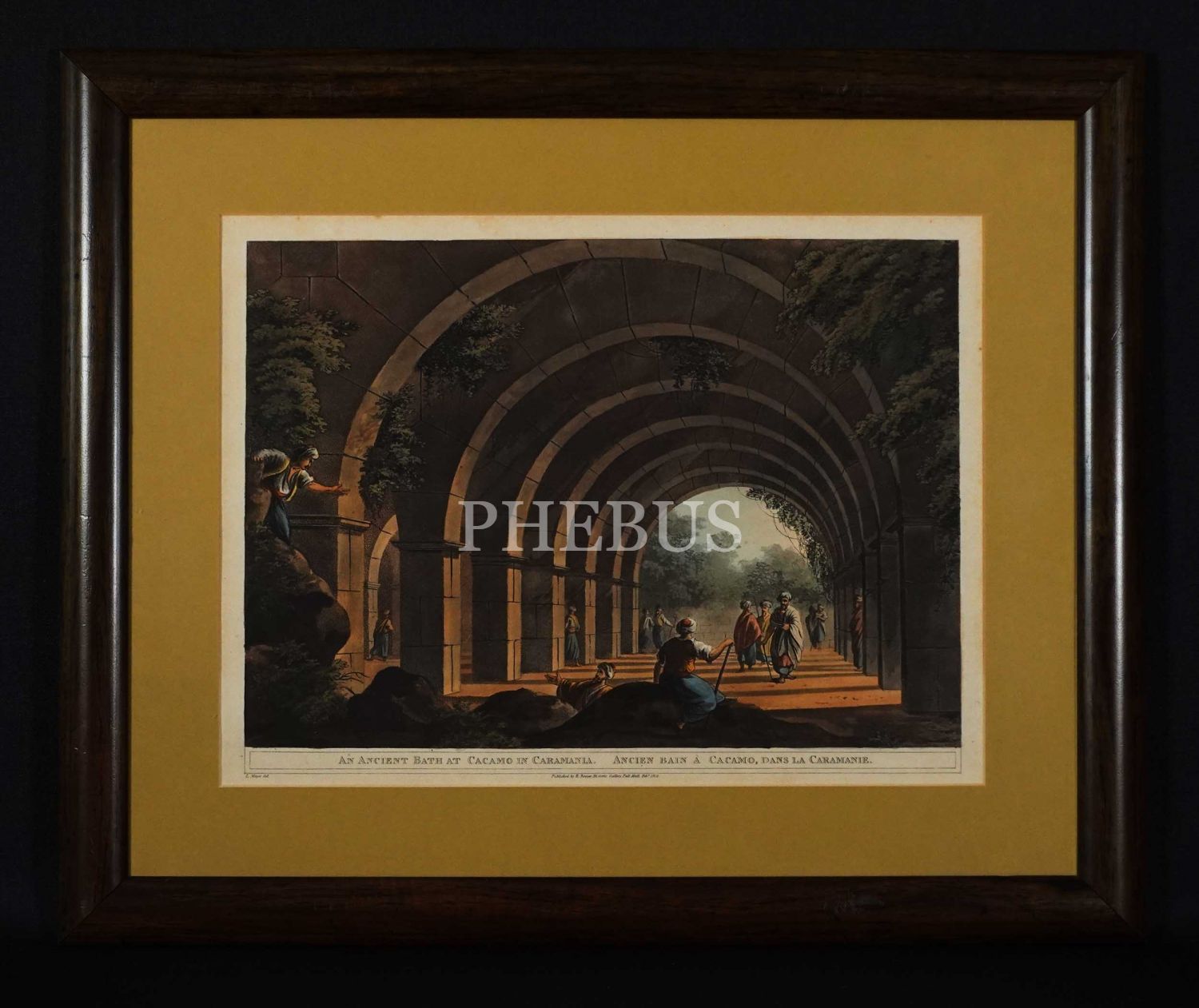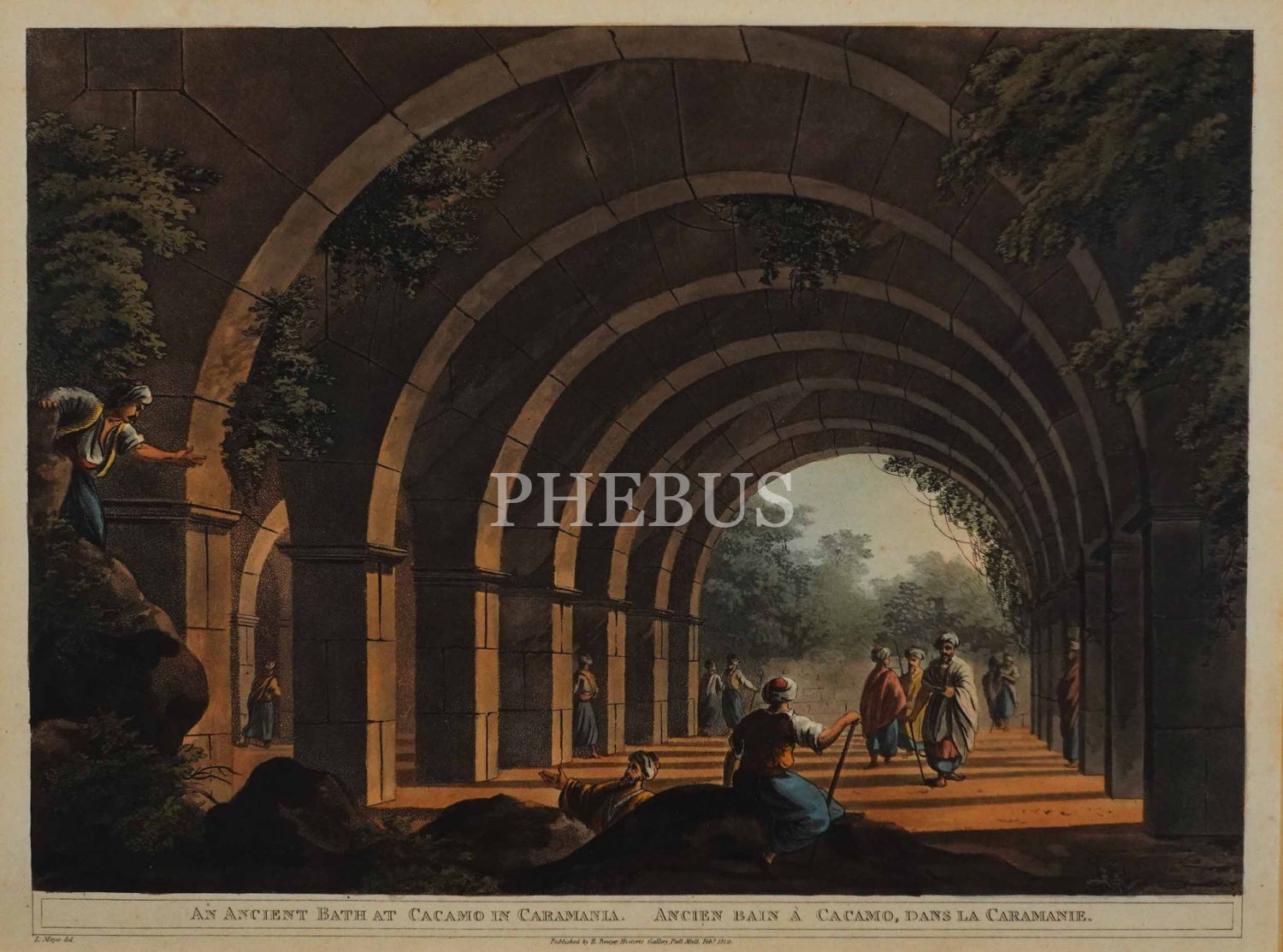 İngilizce-Fransızca açıklamalı "Karaman´ın Cacamo (Demre, Andriake) kentinde antik bir hamam" konulu taş baskı renkli gravür, (Luigi) Mayer, yayıncı: Robert Bowyer, Historic Gallery, Pall Mall, 1812, çerçevesiyle birlikte 48x40 cm...