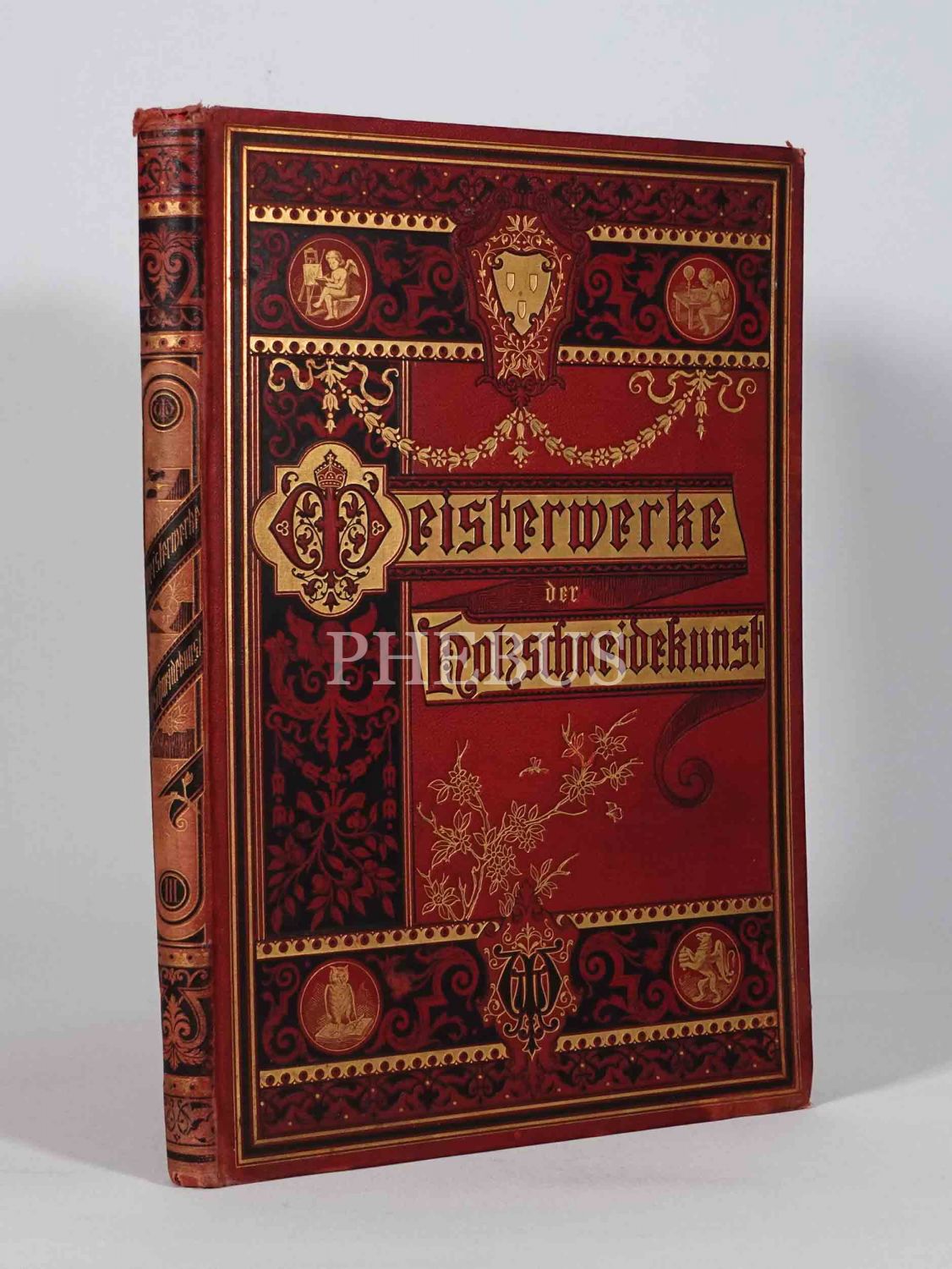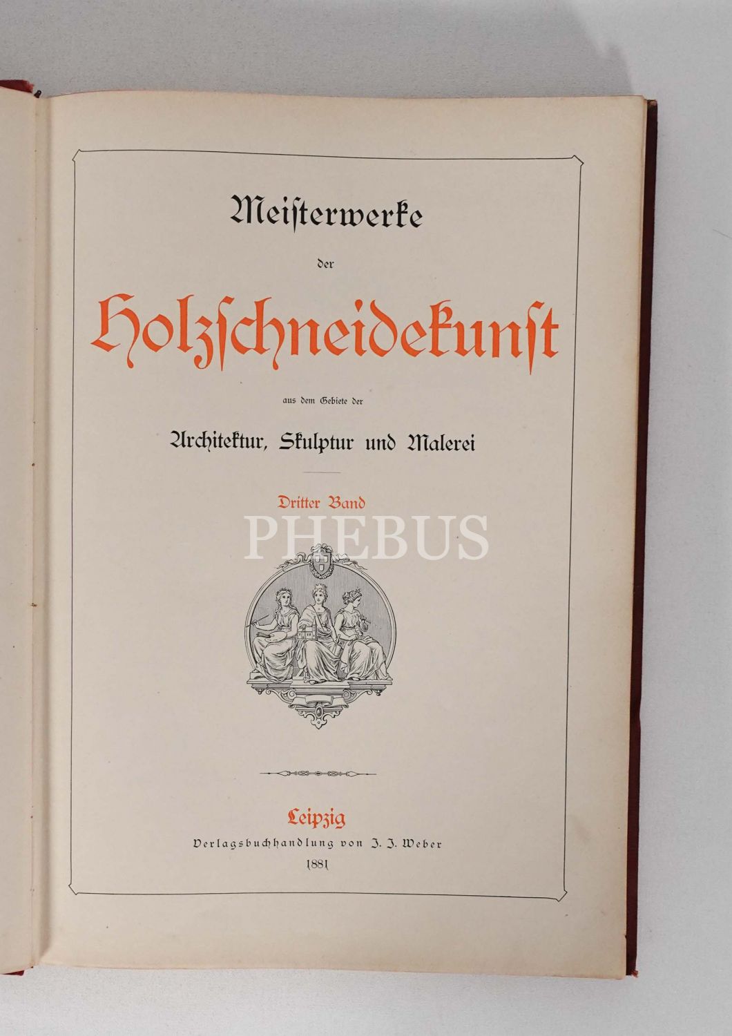 Mimari, heykel, doğa ve resim konulu ahşap oyma baskı gravürlerden nadide seçkileri bir araya getiren Almanca kitap: MEISTERWERKE DER HOLZSCHNEIDEKUNST (3. cilt), Verlagsbuchhandlung von 3. 3. Weber, Leipzih, 1881, 52 sayfa metin + 74 adet gravür, 30x43 cm...