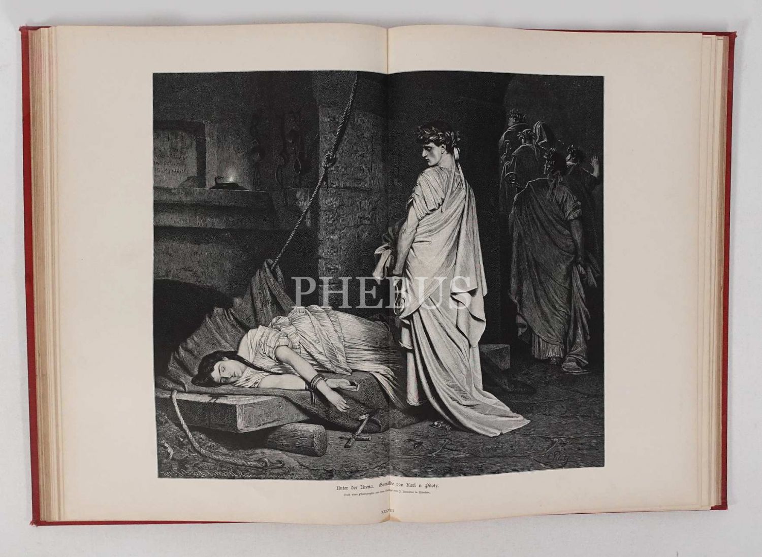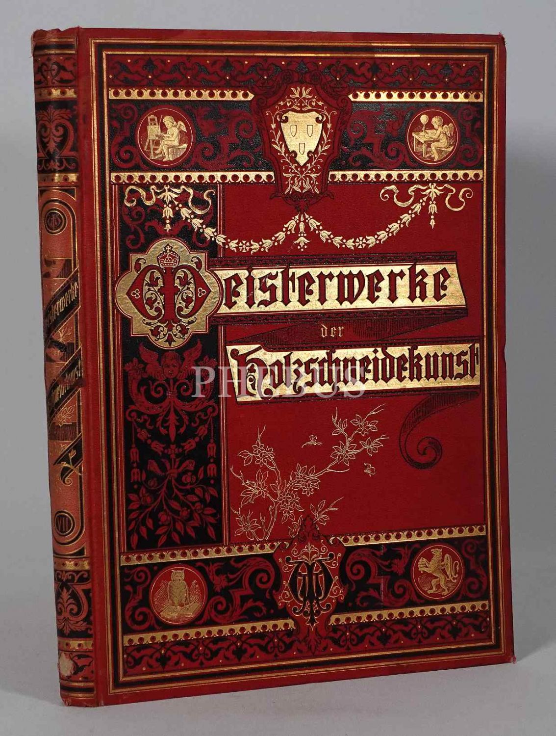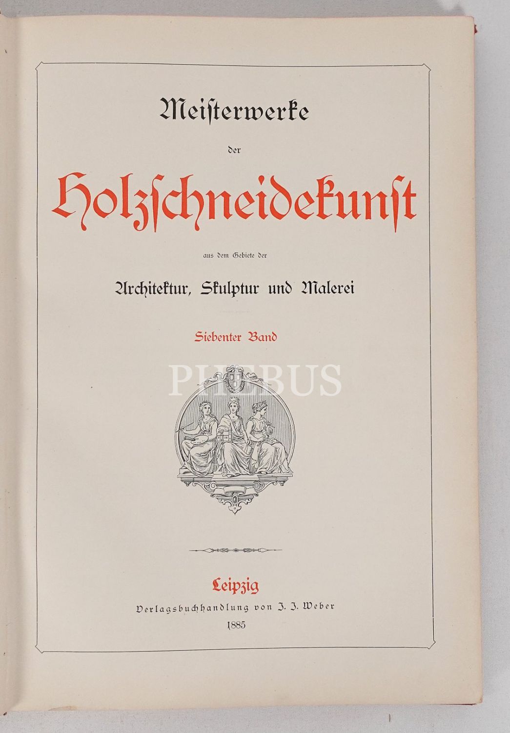 Mimari, heykel, doğa ve resim konulu ahşap oyma baskı gravürlerden nadide seçkileri bir araya getiren Almanca kitap: MEISTERWERKE DER HOLZSCHNEIDEKUNST (7. cilt), Verlagsbuchhandlung von 3. 3. Weber, Leipzih, 1885, 50 sayfa metin + 77 adet gravür, 30x43 cm...