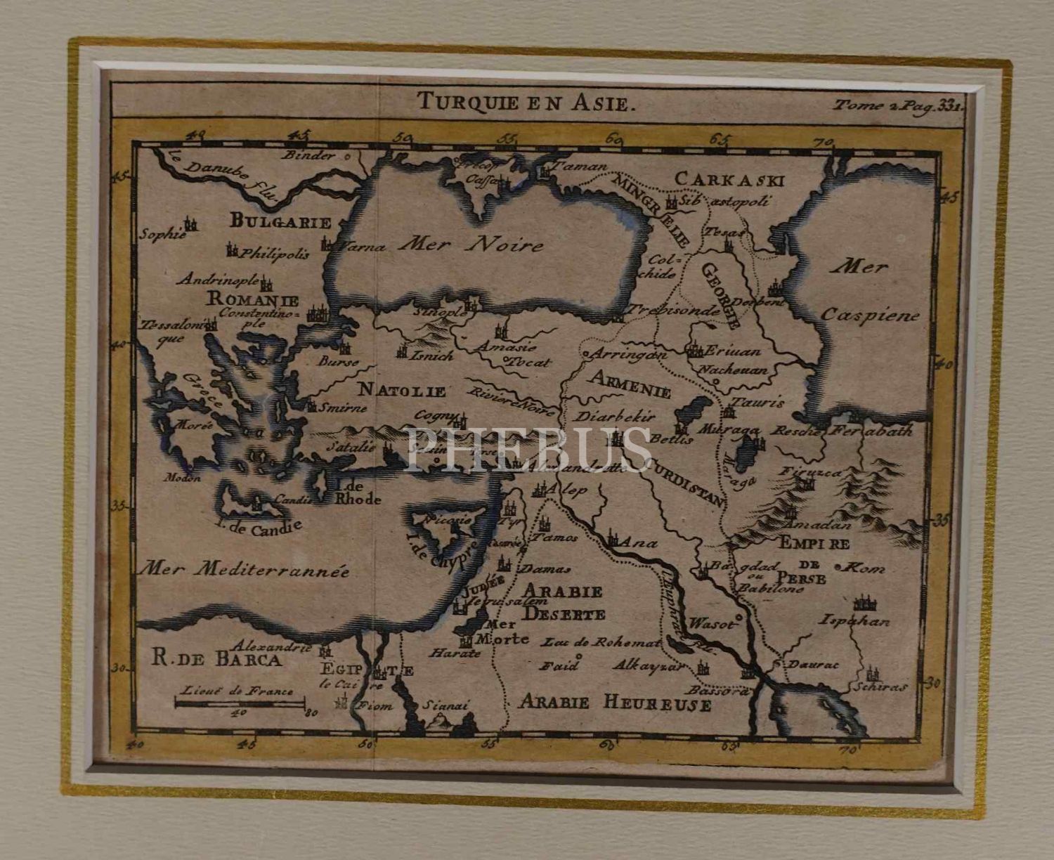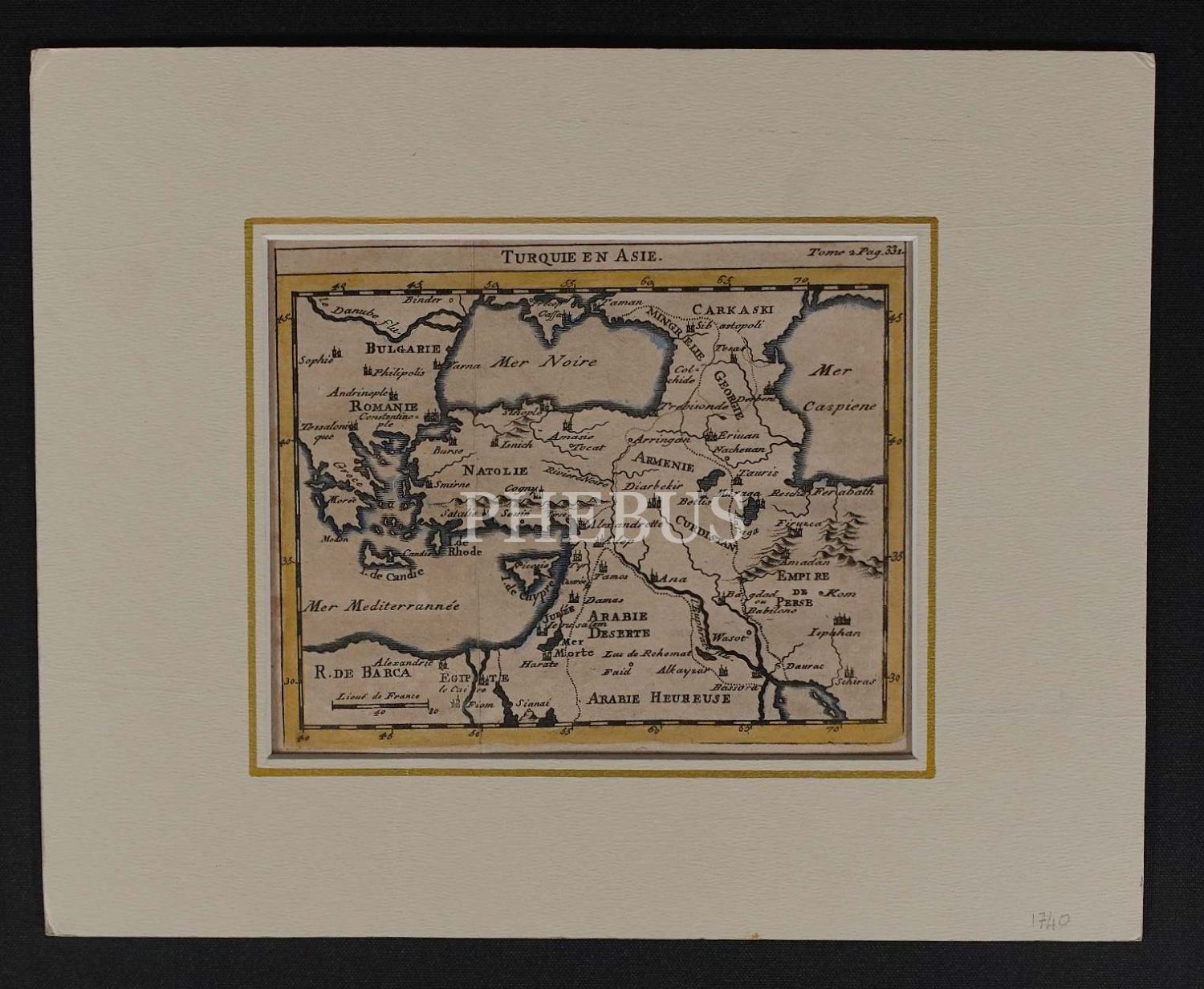 "Fransız haritacılığının babası" olarak tanınan Nicolas Sanson tarafından çizilen (1600-1667) "Türkiye ve Asya" (Turquie en Asie) haritasının elle renklendirilmiş kopyası, 19x17 cm...