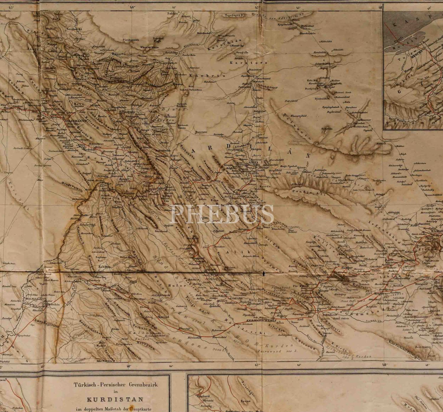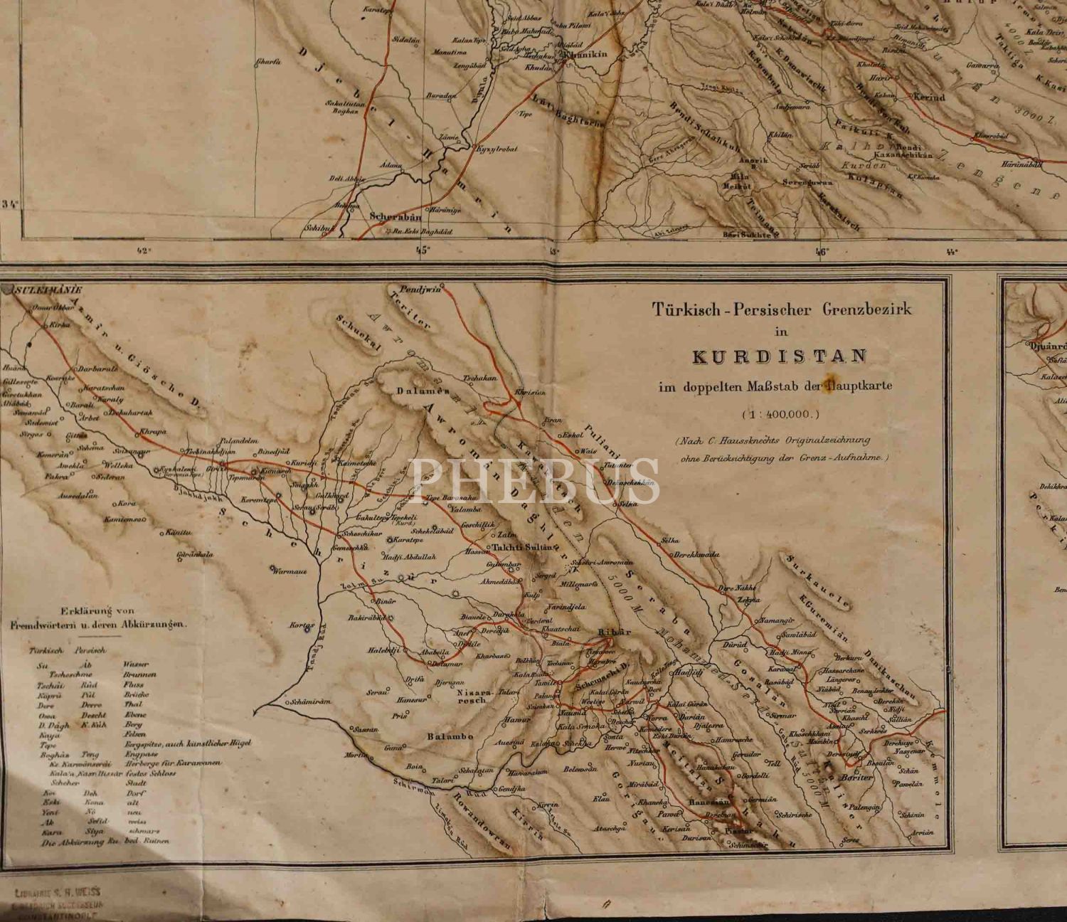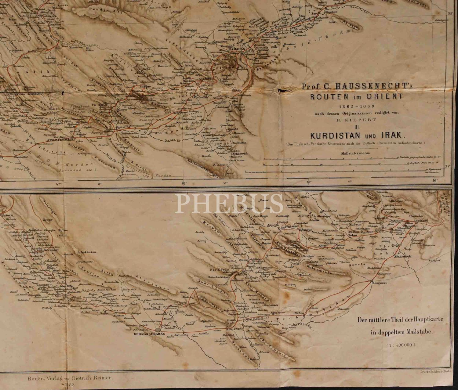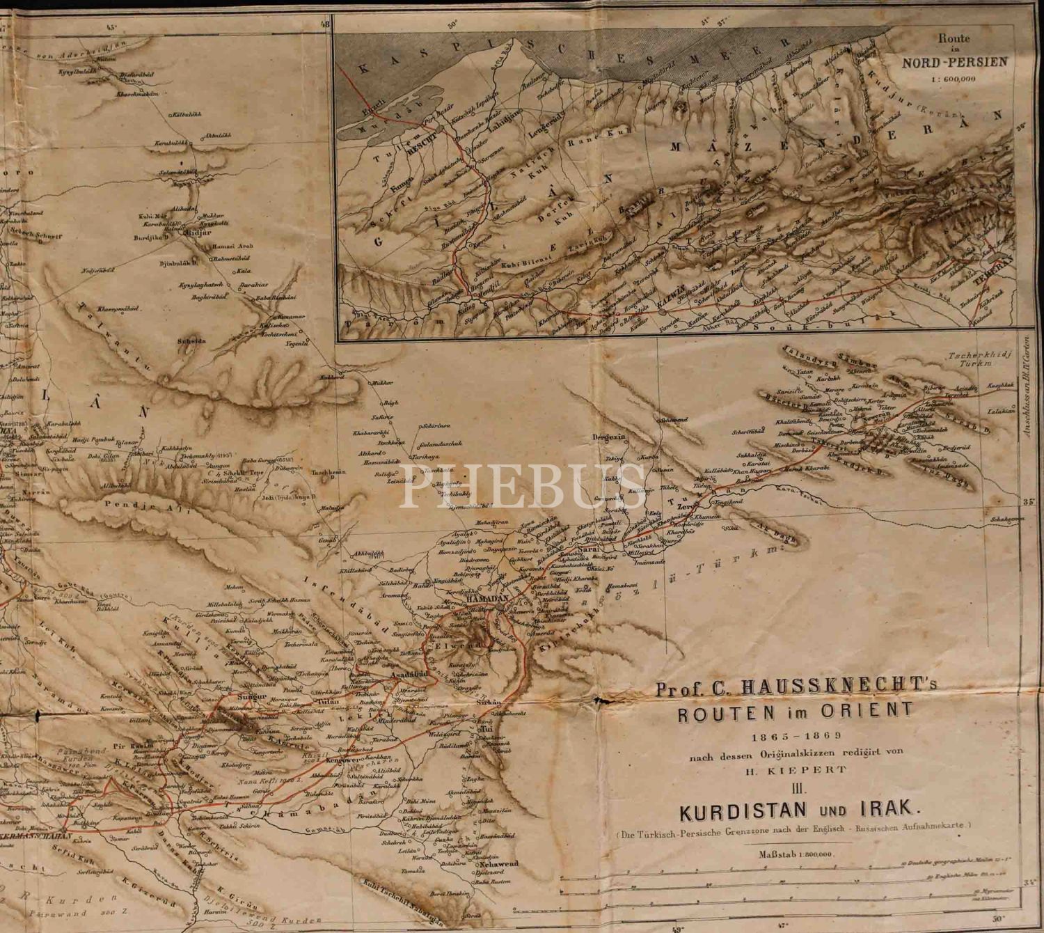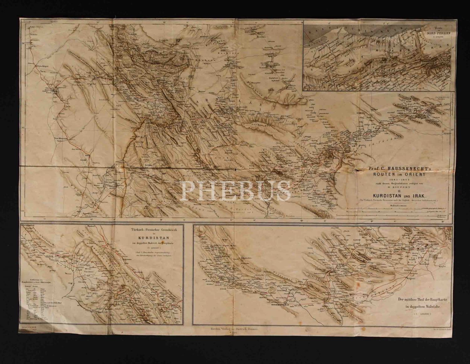 Alman botanist Carl Haussknecht´in 1865 ve 1869 yıllarında örnek toplamak amacıyla gerçekleştirdiği Anadolu gezilerinde aldığı eskizlerin Heinrich Kiepert tarafından temize çekilmesiyle meydana gelen Kürdistan ve Irak haritası... "Librairie S. H. Weiss (E. Heydrich Successour) Constantinople" damgalı.