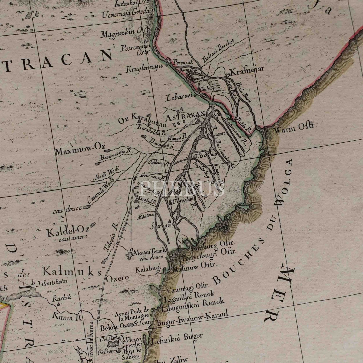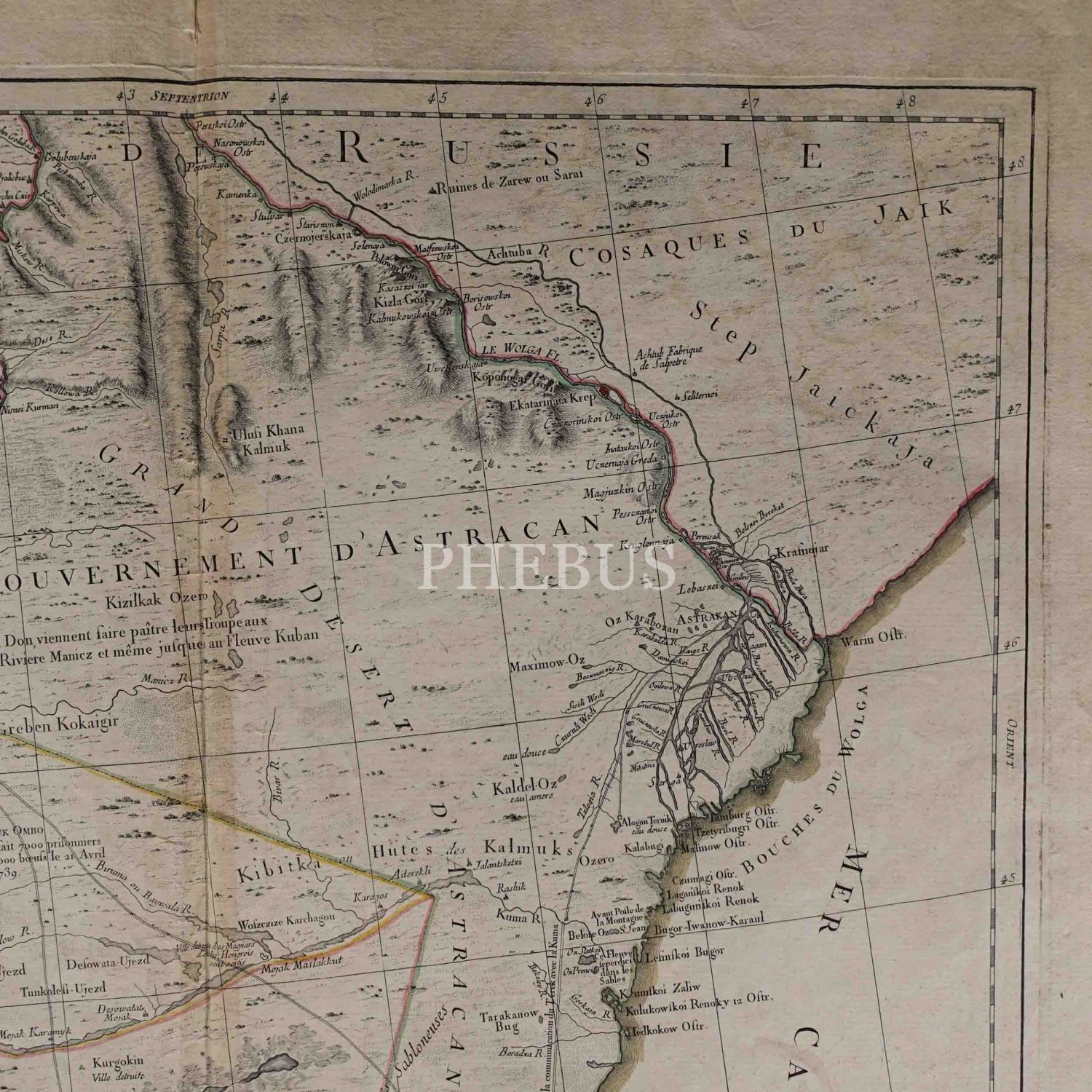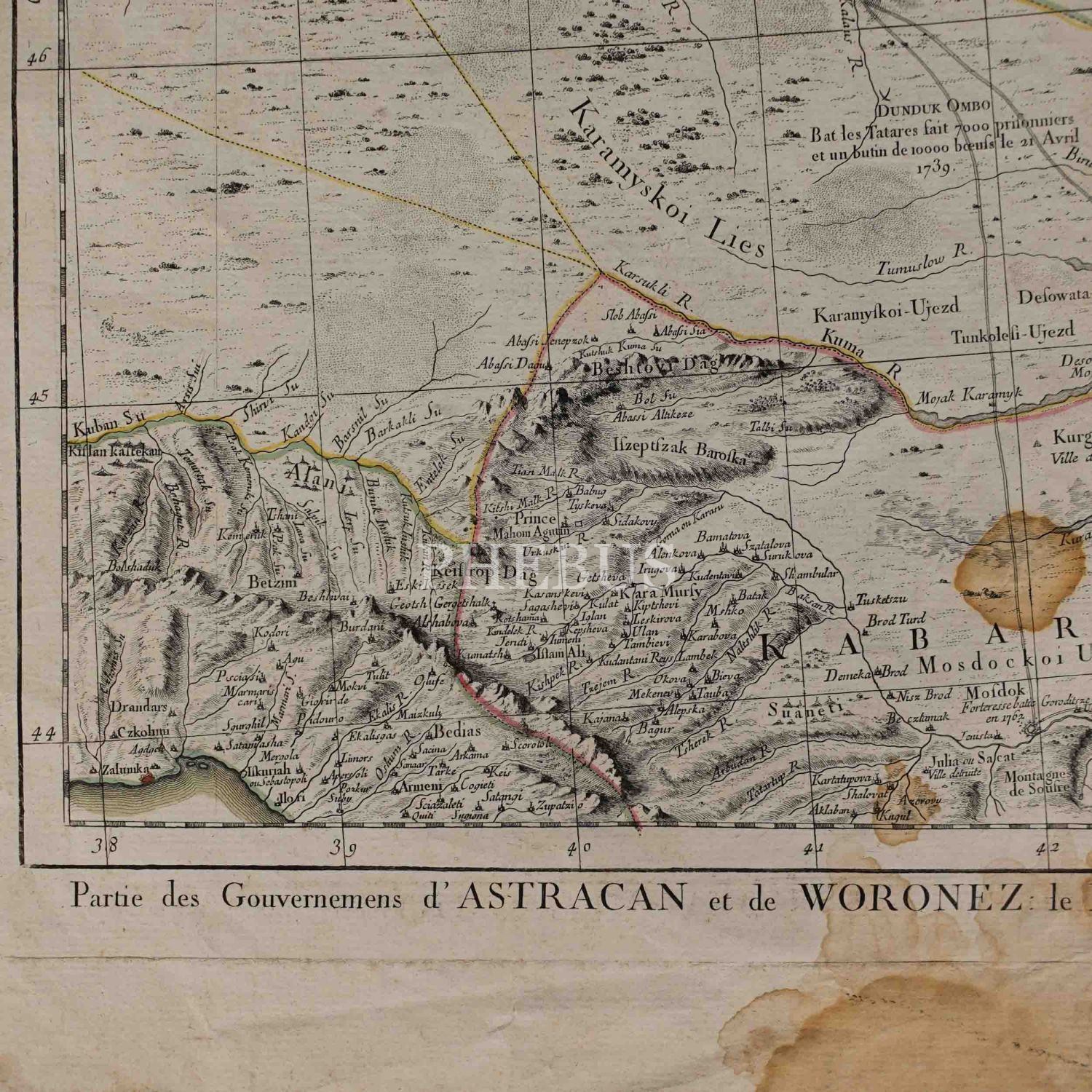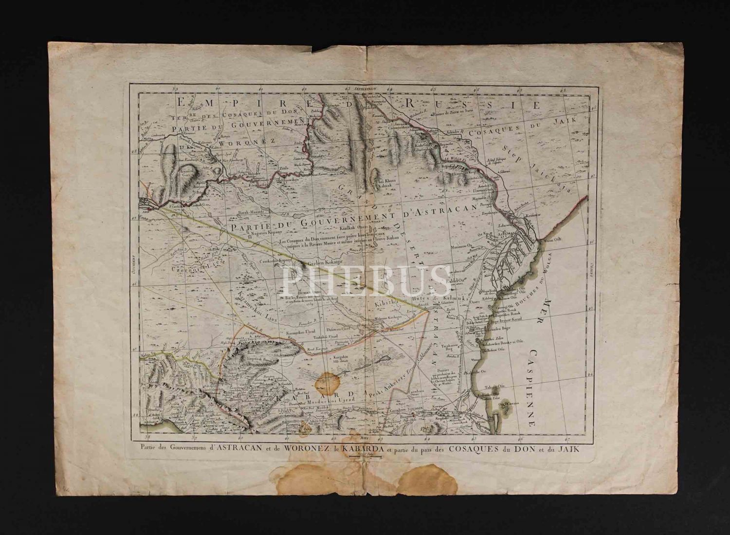Karadeniz´in kuzeyindeki ve Hazar Denizi´nin batısındaki bölgenin elle renklendirilmiş ayrıntılı haritası: "Partie des Gouvernemens d´Astracan et de Woronez: le Kabarda et partie du païs des Cosaques du Don et du Jaik", 1784 Viyana (İtalya) baskı, 74x53 cm...