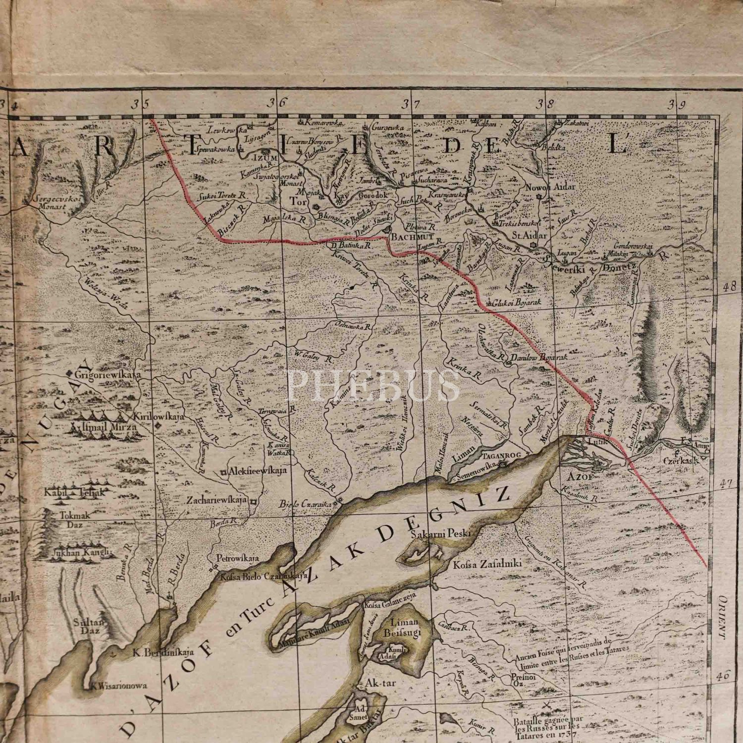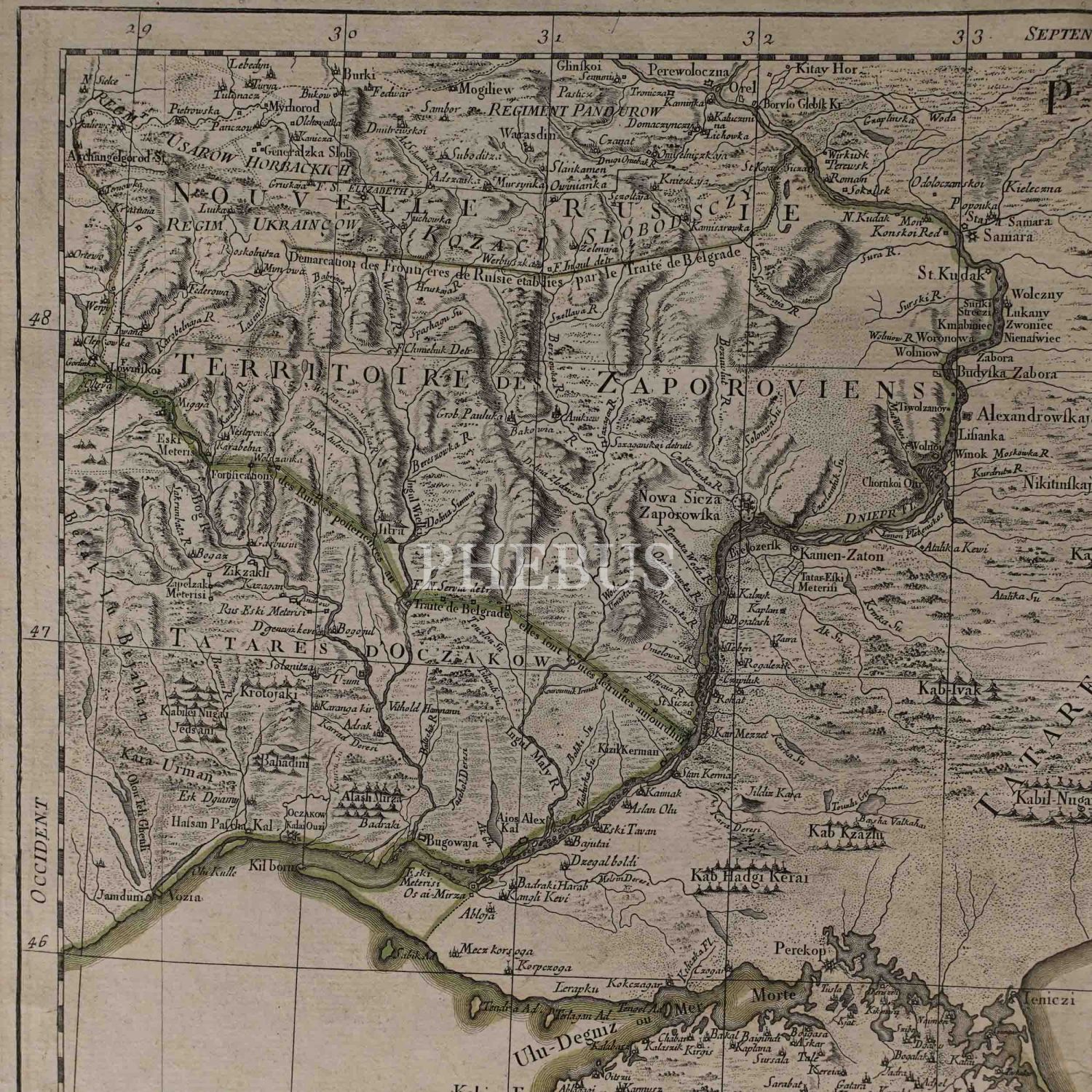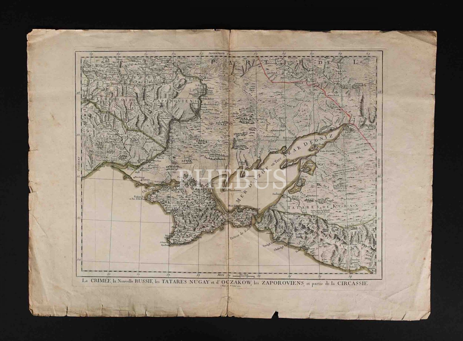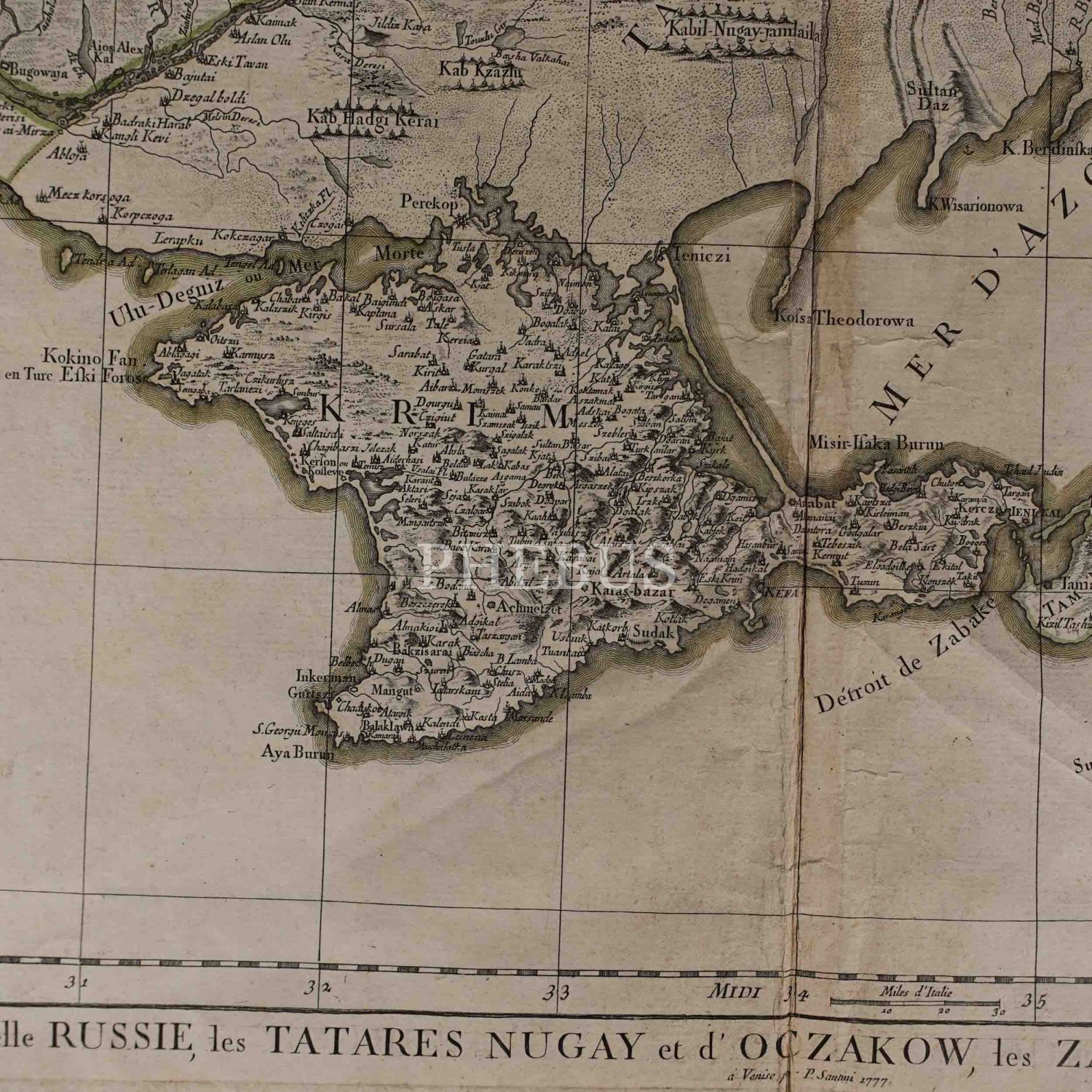 Kırım, Ukrayna ve çevre bölgeleri gösteren 1777 Venedik baskı elle renklendirilmiş harita: "La Crimée, la Nouvelle Russie, les Tatares Nugay et d´Oczakow, les Zaporoviens, et partie de la Circassie", yayıncı: P. Santini, 74x53 cm...