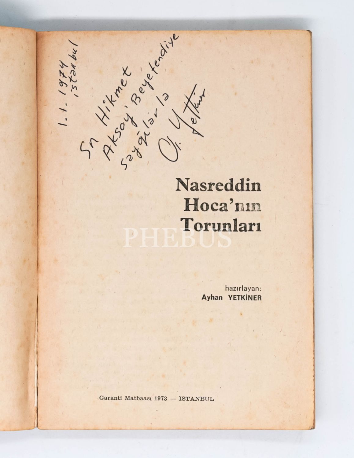 İthaf, "Sn. Hikmet Aksoy Beyefendiye saygılarla 1.1.1974 İstanbul" şeklindedir.