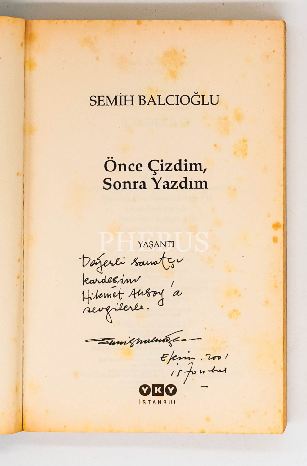 İthaf, "Değerli sanatçı kardeşim Hikmet Aksoy´a sevgilerle. Ekim 2001 İstanbul" şeklindedir.