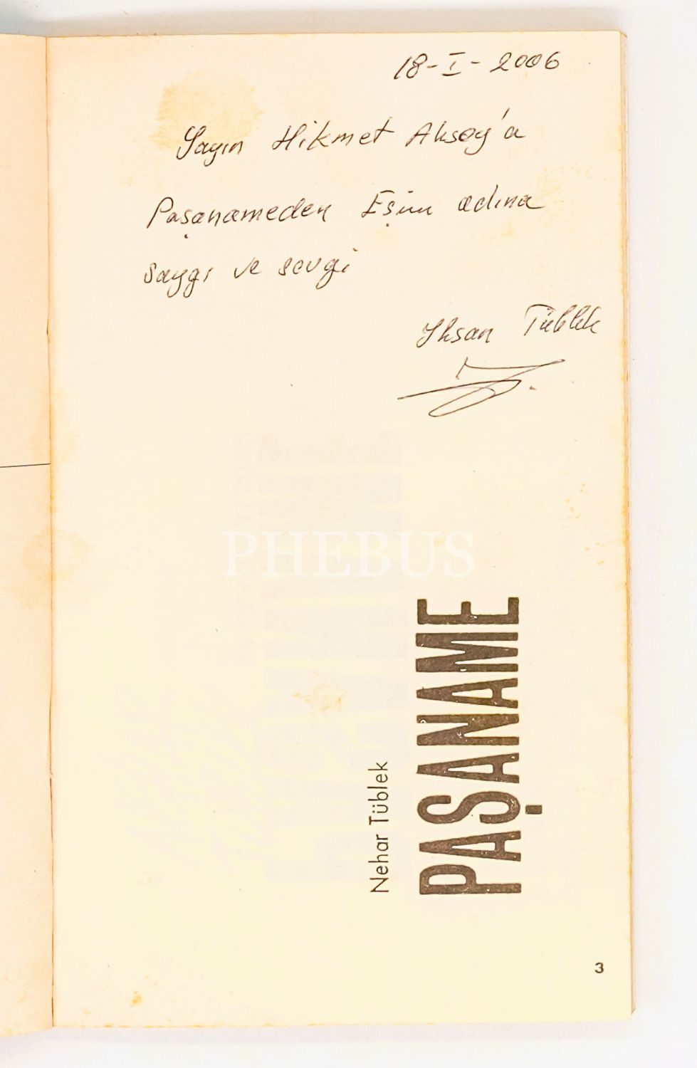 İthaf, "Sayın Hikmet Aksoy´a Paşaname´den eşim adına saygı ve sevgi" şeklindedir.