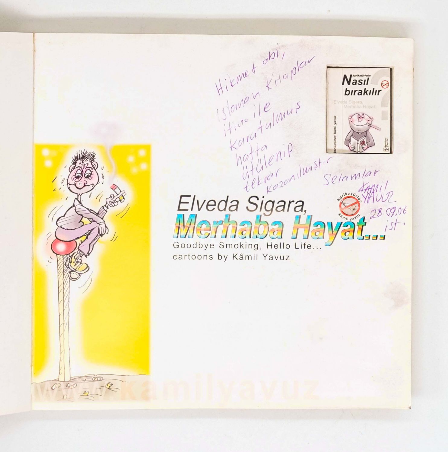 İthaf, "Hikmet Abi, ıslanan kitaplar itina ile kurutulmuş hatta ütülenip tekrar kazanılmıştır Selamlar 28.09.08" şeklindedir. Kitap su görmüştür.