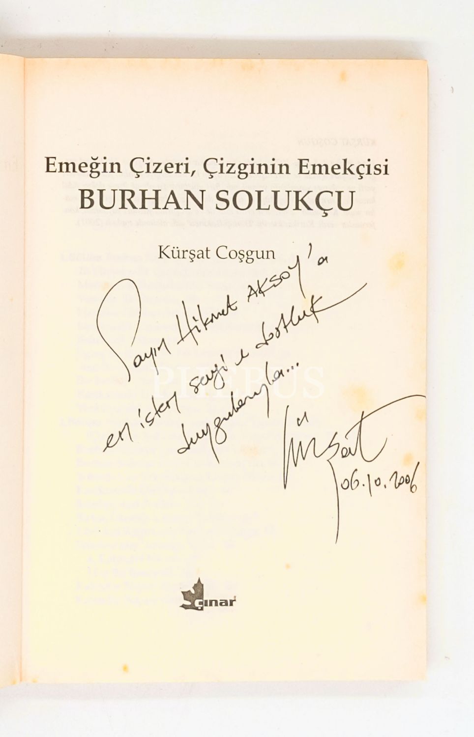 İthaf, "Sayın Hikmet Aksoy´a en içten sevgi ve dostluk duygularıyla... 06.10.2006" şeklindedir.