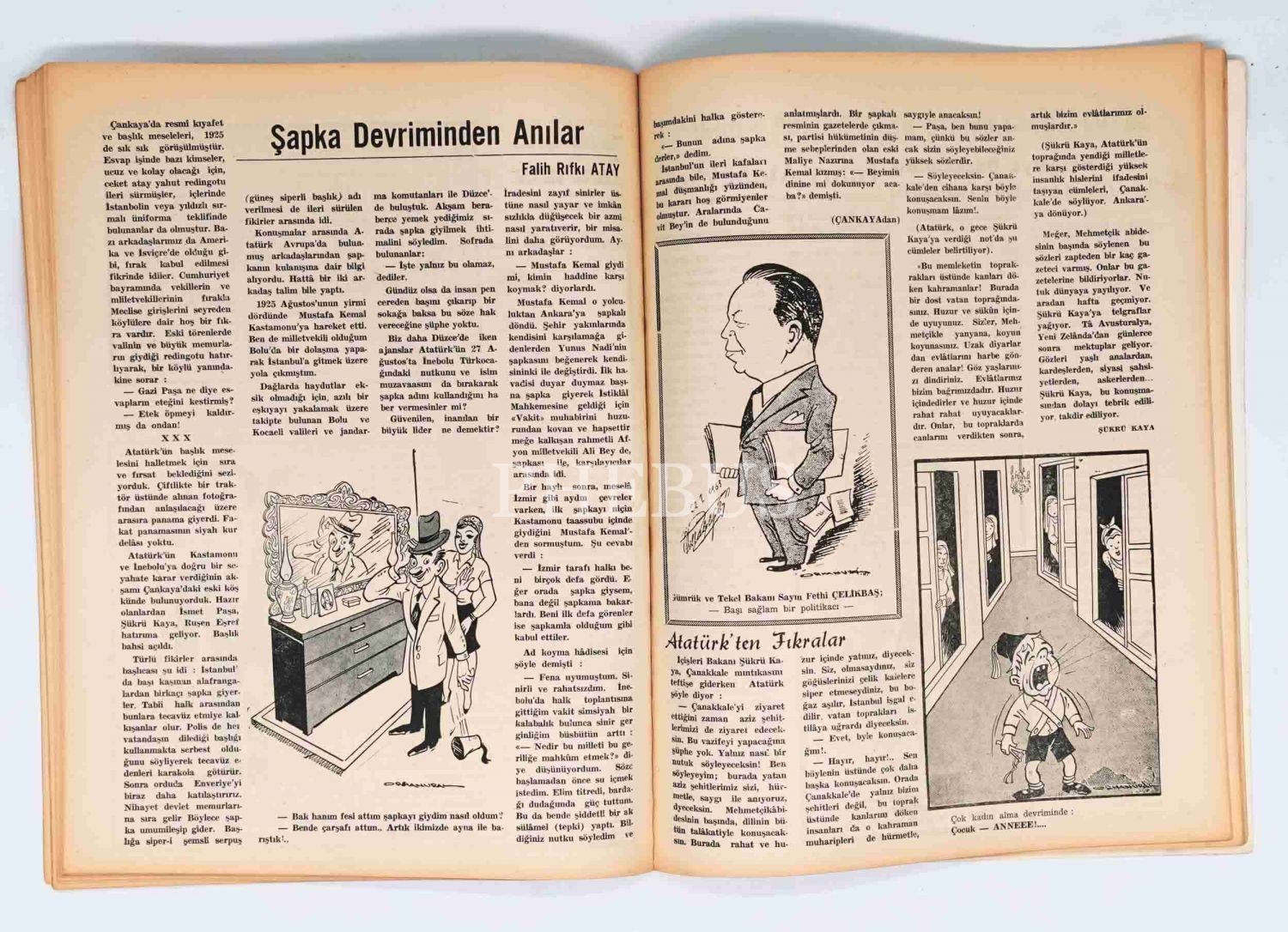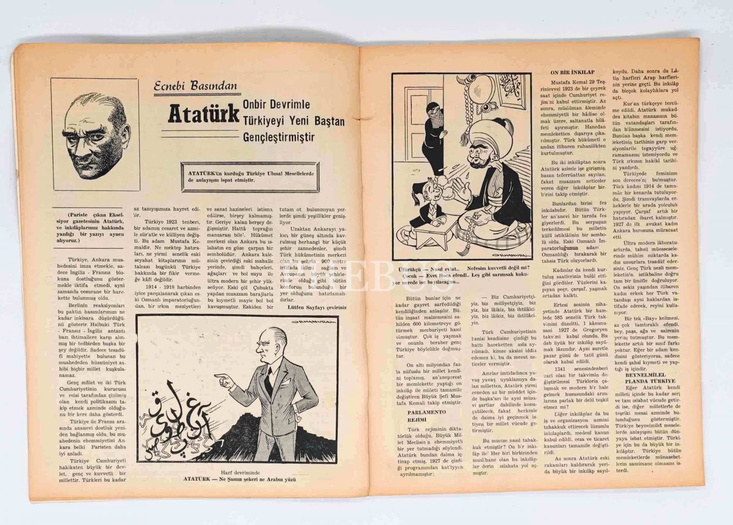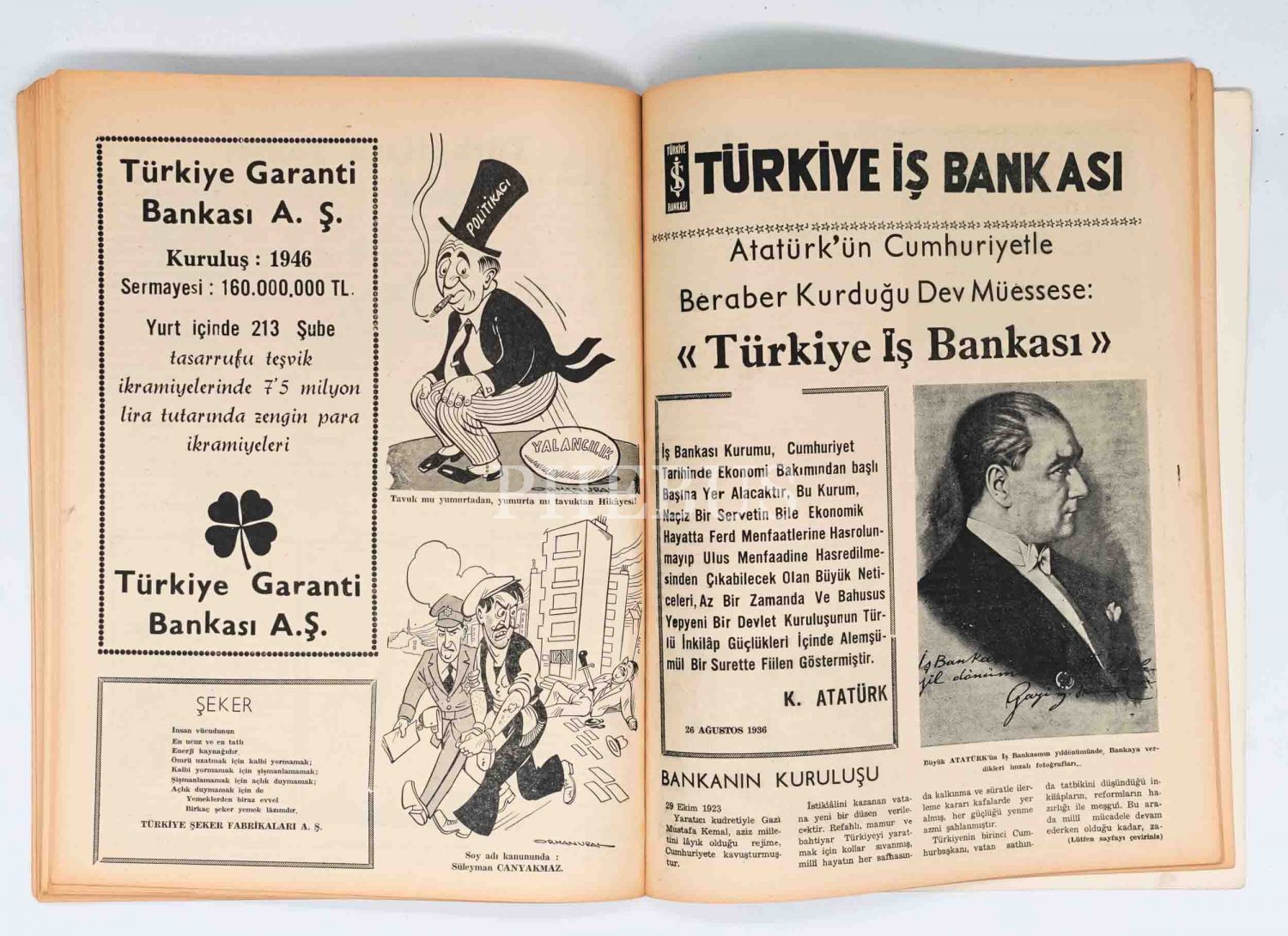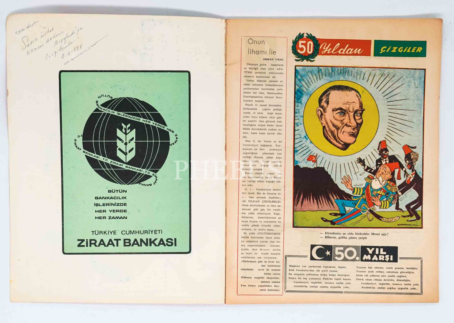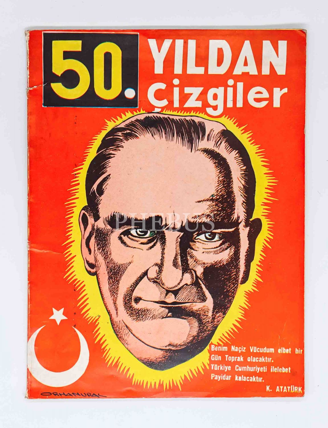 Yazarları arasında Falih Rıfkı Atay, Orhan Seyfi Orhon, Celal Bayar´ında yer aldığı tamamı Cumhuriyet, Atatürk konulu yazılar ve Orhan Ural´ın yaptığı çizimler içeren Cumhuriyet´in 50. yılı münasebetiyle yayınlanan, Atatürk kapaklı 50. YILDAN ÇİZGİLER dergisi, 24x32 cm...