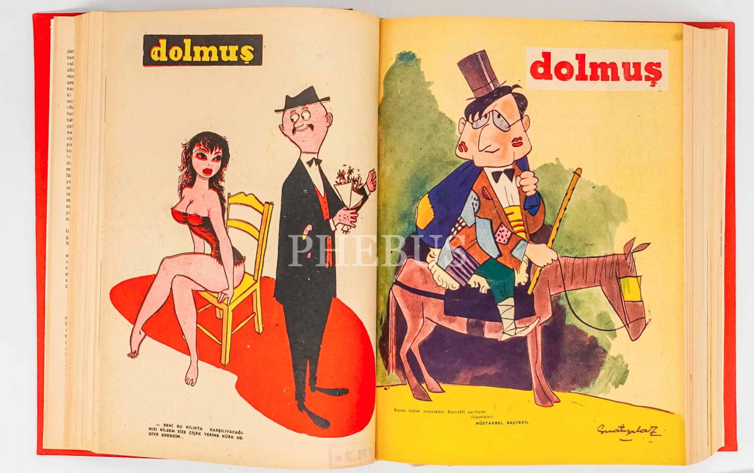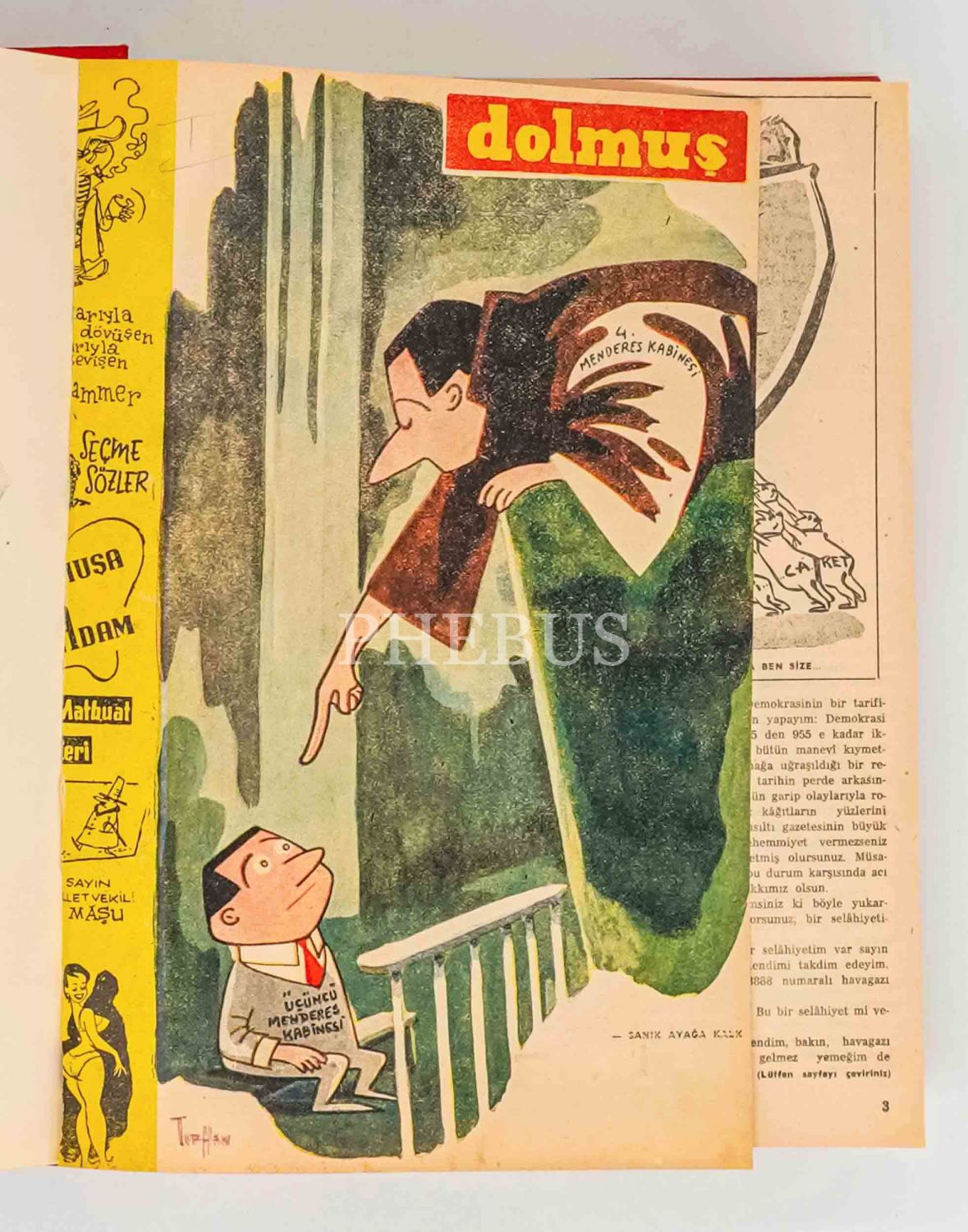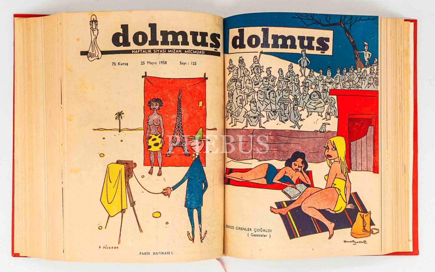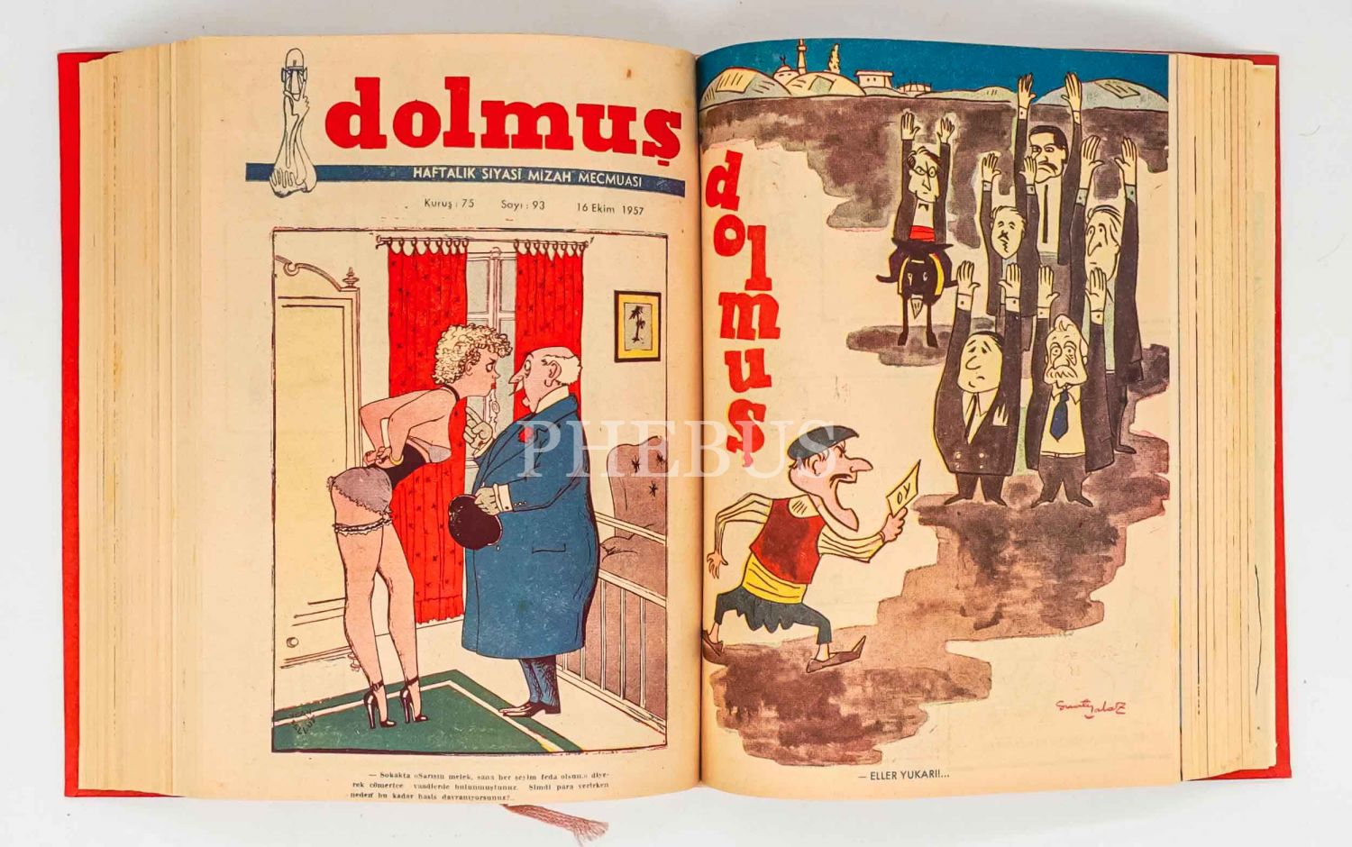 Siyasi mizah mecmuası DOLMUŞ´un 5 Ocak 1956- 3 Eylül 1958 tarihleri arasında yayınlanan 1-139 arası sayıları, 27x20 cm...