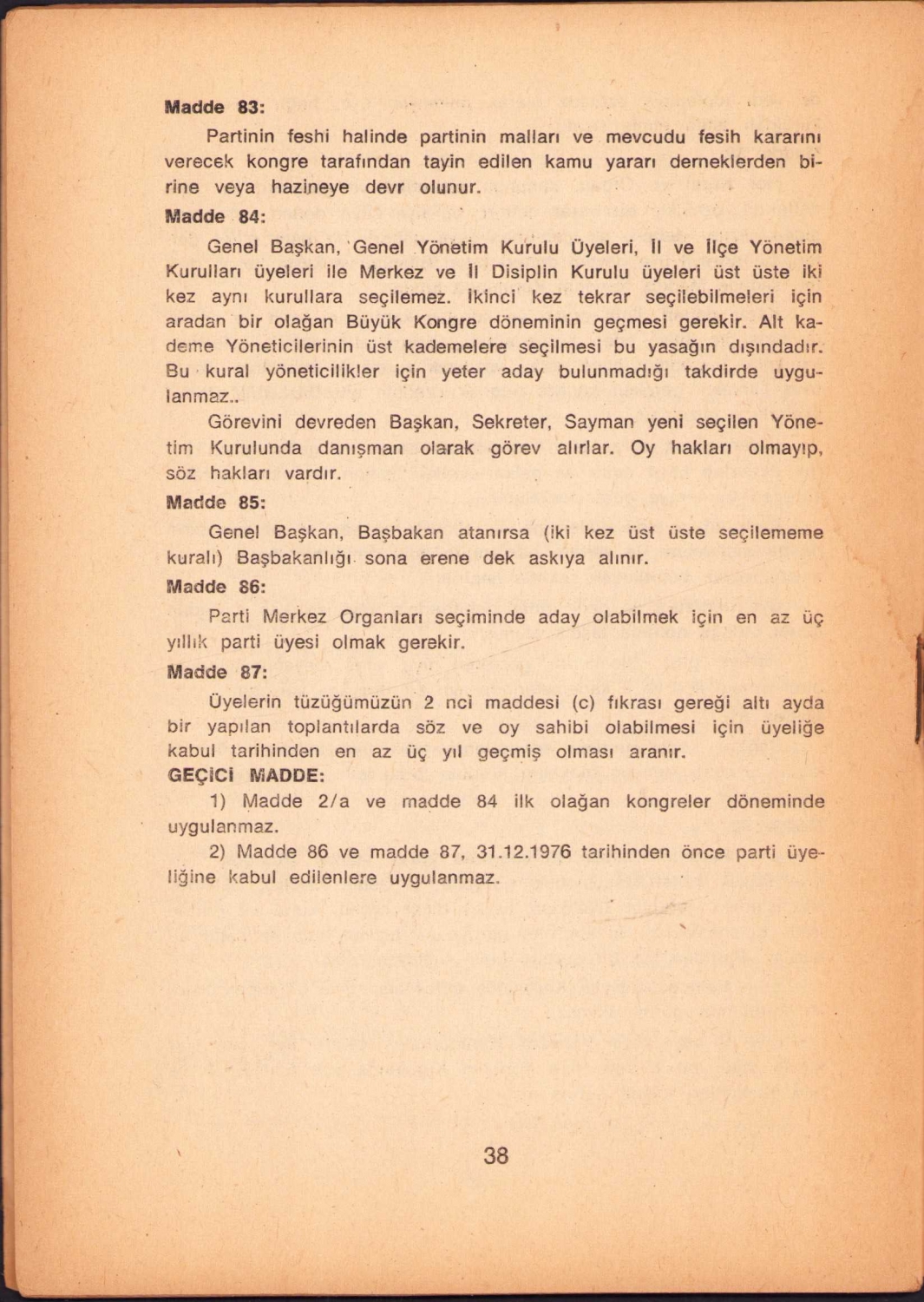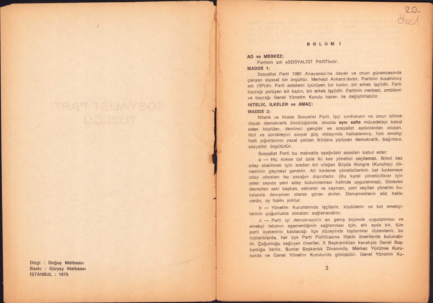 Sosyalist Parti Tüzüğü, 1975, 38 sayfa, 14x20 cm