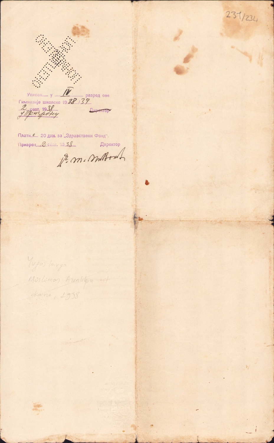 Eğitim, Yugoslav öğrenciye verilmiş karne, 1938, 24x34 cm