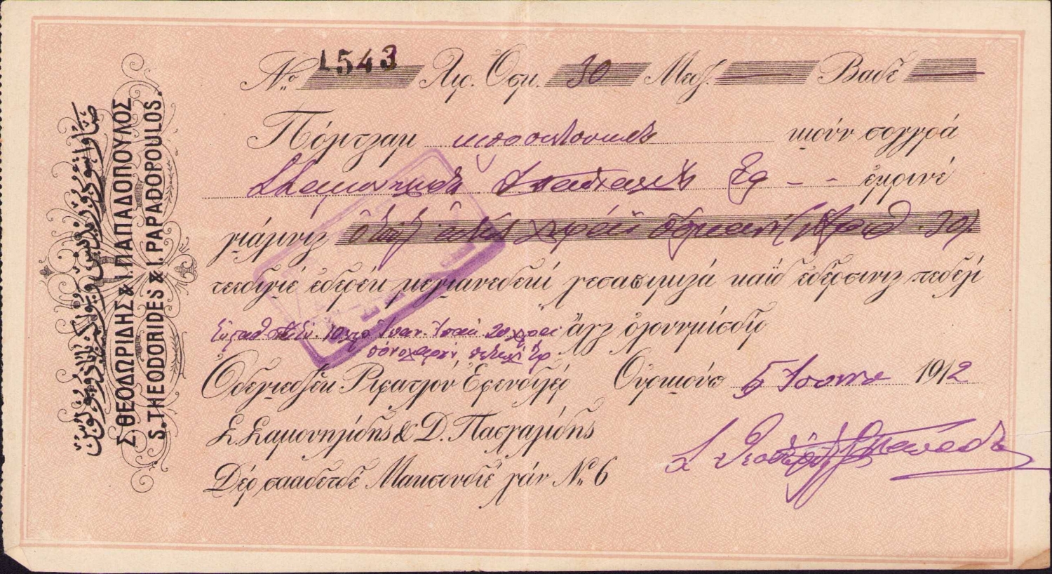Osmanlıca Karamanlıca Fransızca 3 dilde S. Theodorides & Y. Papadupolus 1912 tarihli senet, 22x12 cm
