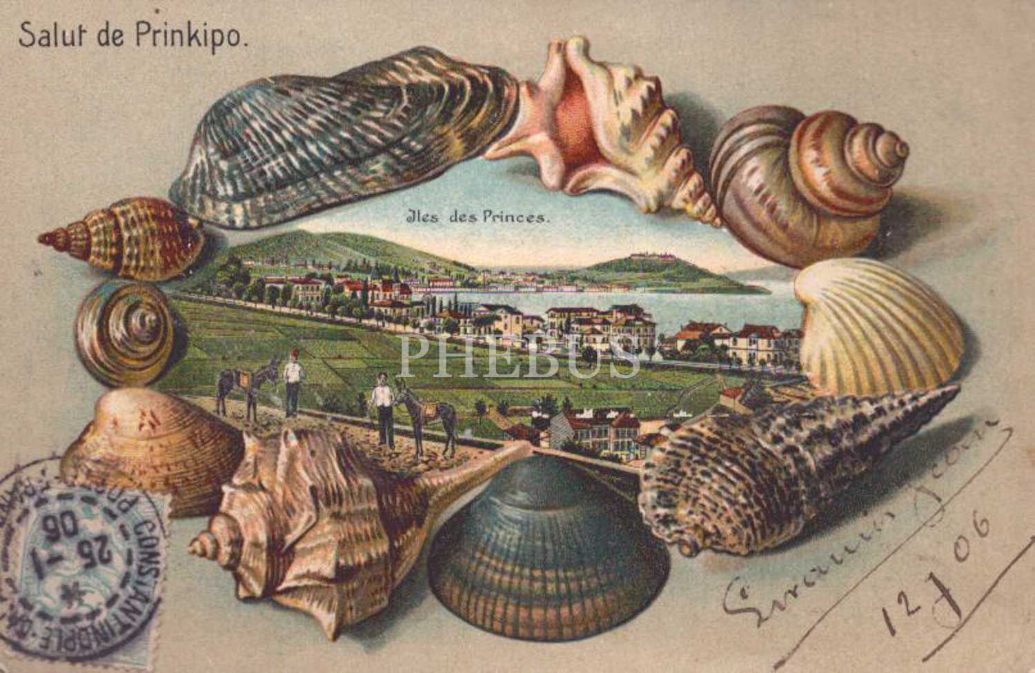 Büyük Ada görselli gofre kabuklu kartpostal, "Salut de Prinkipo, Iles des Princes", pullu ve postadan geçmiş, İstanbul, 14x9 cm...