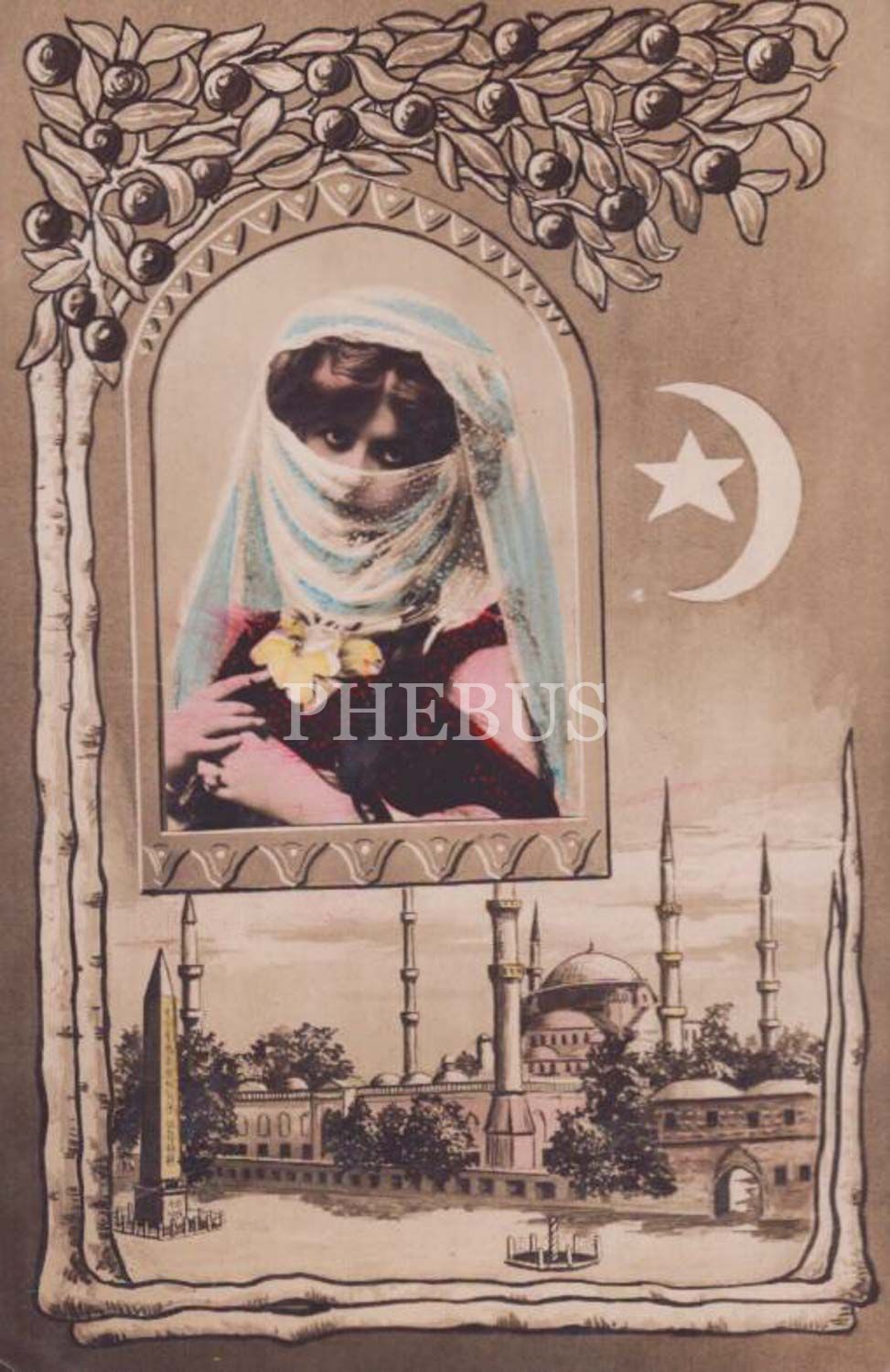 Alman baskı parçalı İstanbul (Sultanahmet) ve Türk kadını kartpostalı, 9x14 cm...