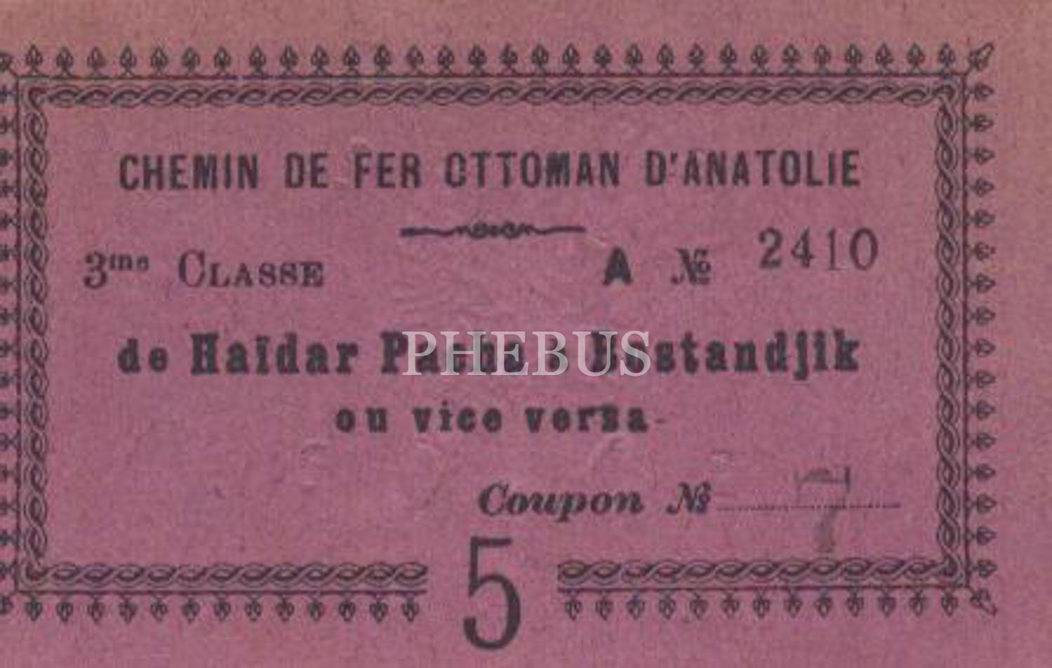 Anadolu Osmanlı Demir Yolları üçüncü mevki´ Haydarpaşa´dan Bostancı´ya tren bileti, Osmanlıca ve Fransızca, 8x5 cm...