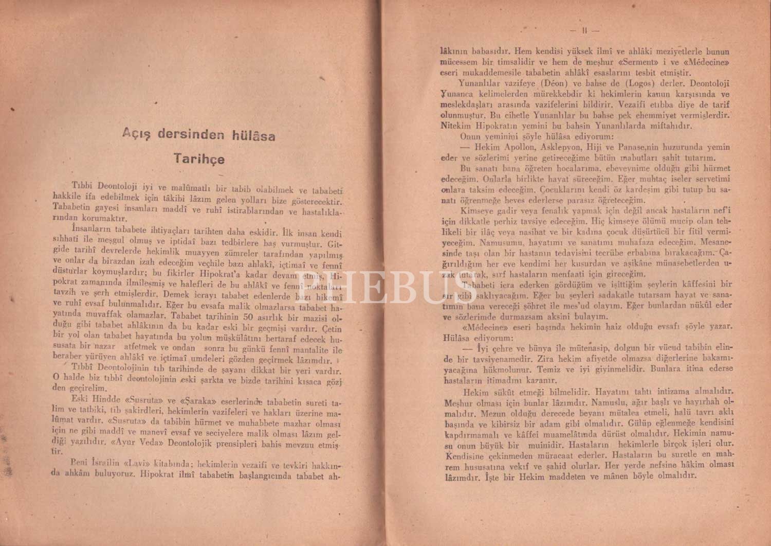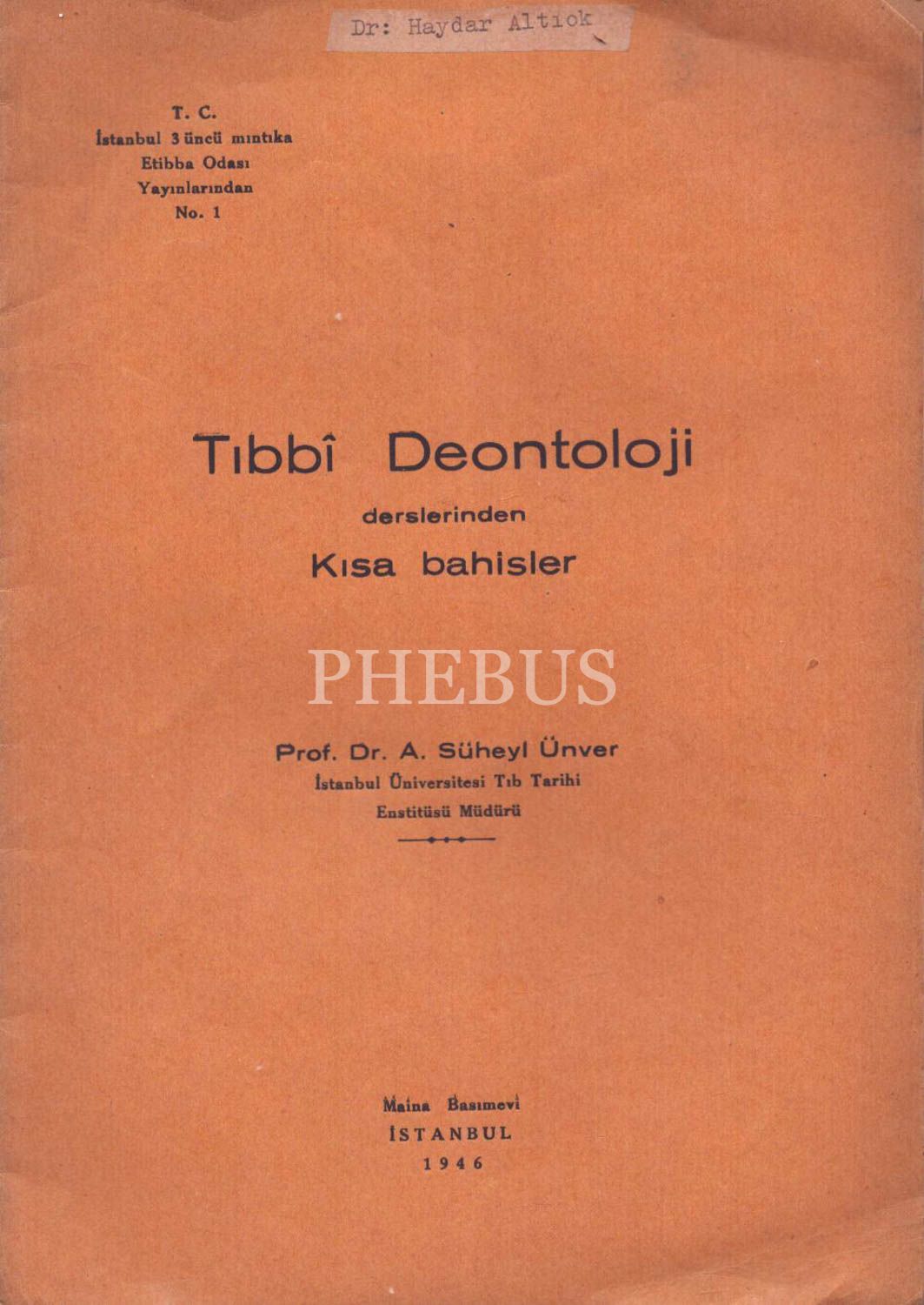 TIBBÎ DEONTOLOJİ DERSLERİNDEN KISA BAHİSLER, A. Süheyl Ünver, T. C. İstanbul 3 üncü mıntıka Etibba Odası Yayınlarından No: 1, 1946, Maina Basımevi, İstanbul, 22 sayfa, 17x24 cm...