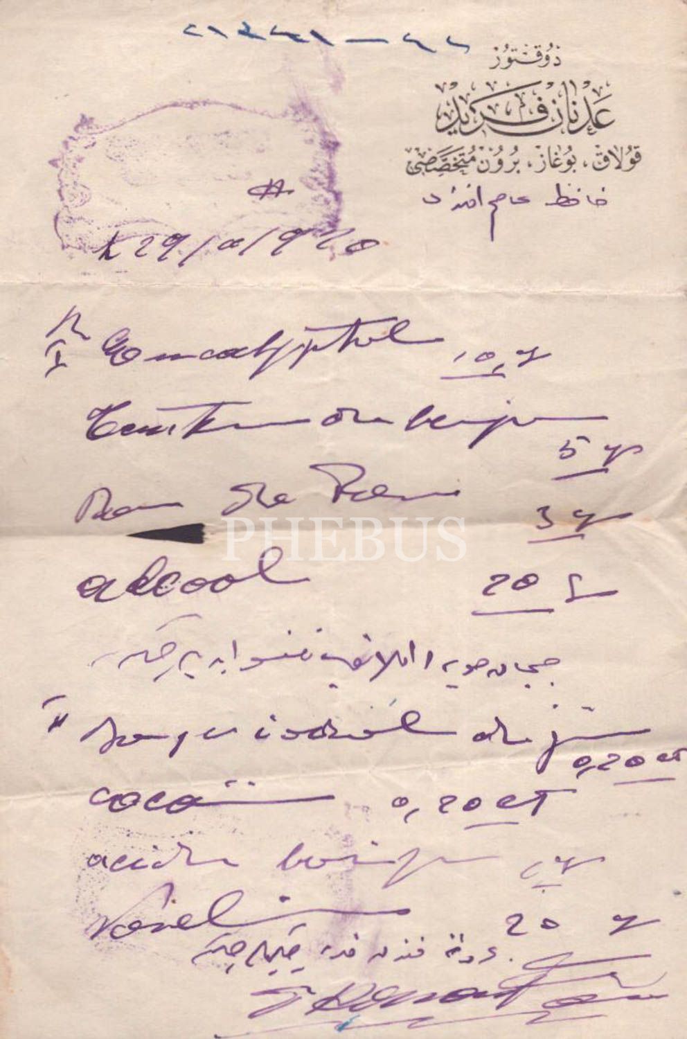 "Doktor Adnan Ferit kulak, burun, boğaz mütehassısı" antetli Hafız Asım Efendi Adına düzenlenmiş Osmanlıca reçete, 14x20 cm...