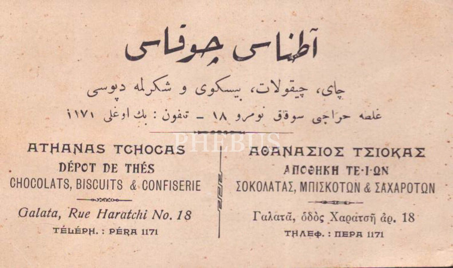 İstanbul Galata´da Atnası Çokas çay, çikolata, bisküvi ve şekerleme deposuna ait iş yeri kartı, Osmanlıca, Rumca ve Fransızca, 14x8 cm...
