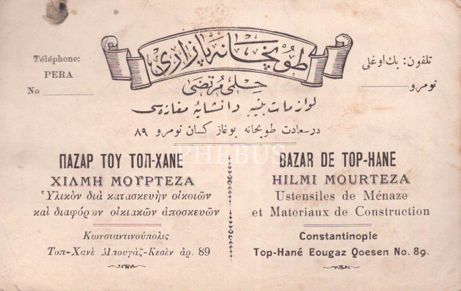 İstanbul Beyoğlu´nda Hilmi Murtaza Tophane Pazarı inşaat malzemeleri mağazasına ait iş yeri kartı, Osmanlıca, Fransızca ve Rumca, 16x10 cm...