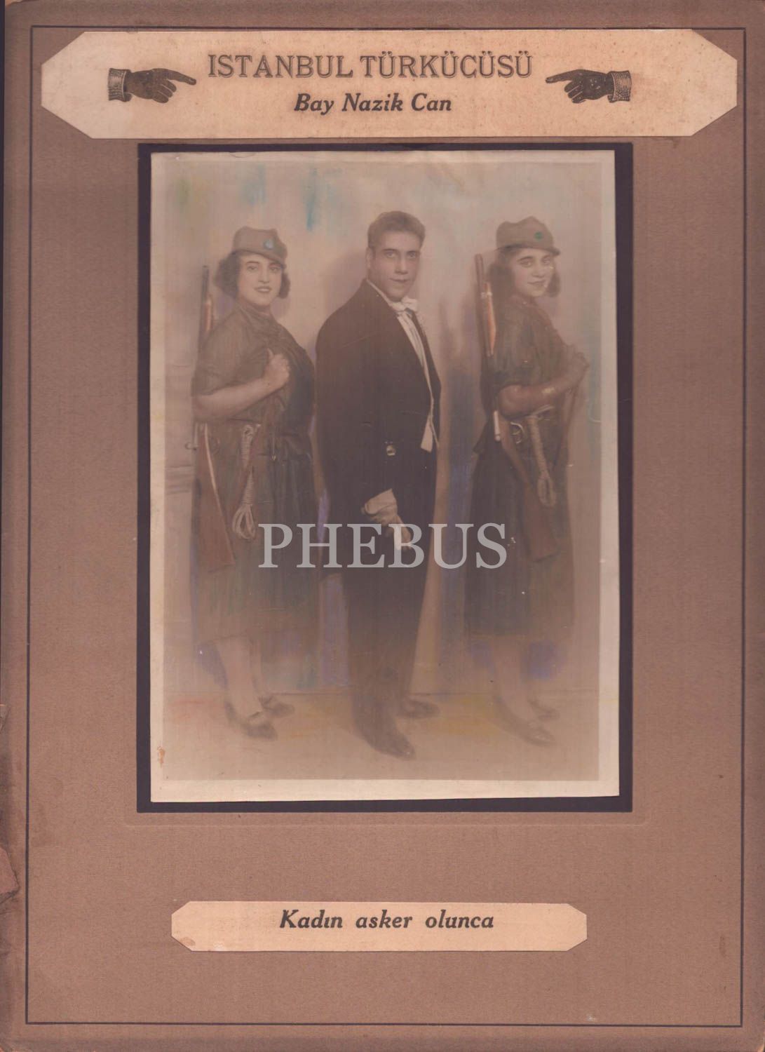 "İstanbul Türkücüsü" Bay Nazik Can tarafından hazırlanmış mizansenle "Kadın asker olunca" konulu amatör fotoğraf, elle renklendirilmiş, paspartu 28x38 cm, fotoğraf 17x23 cm...