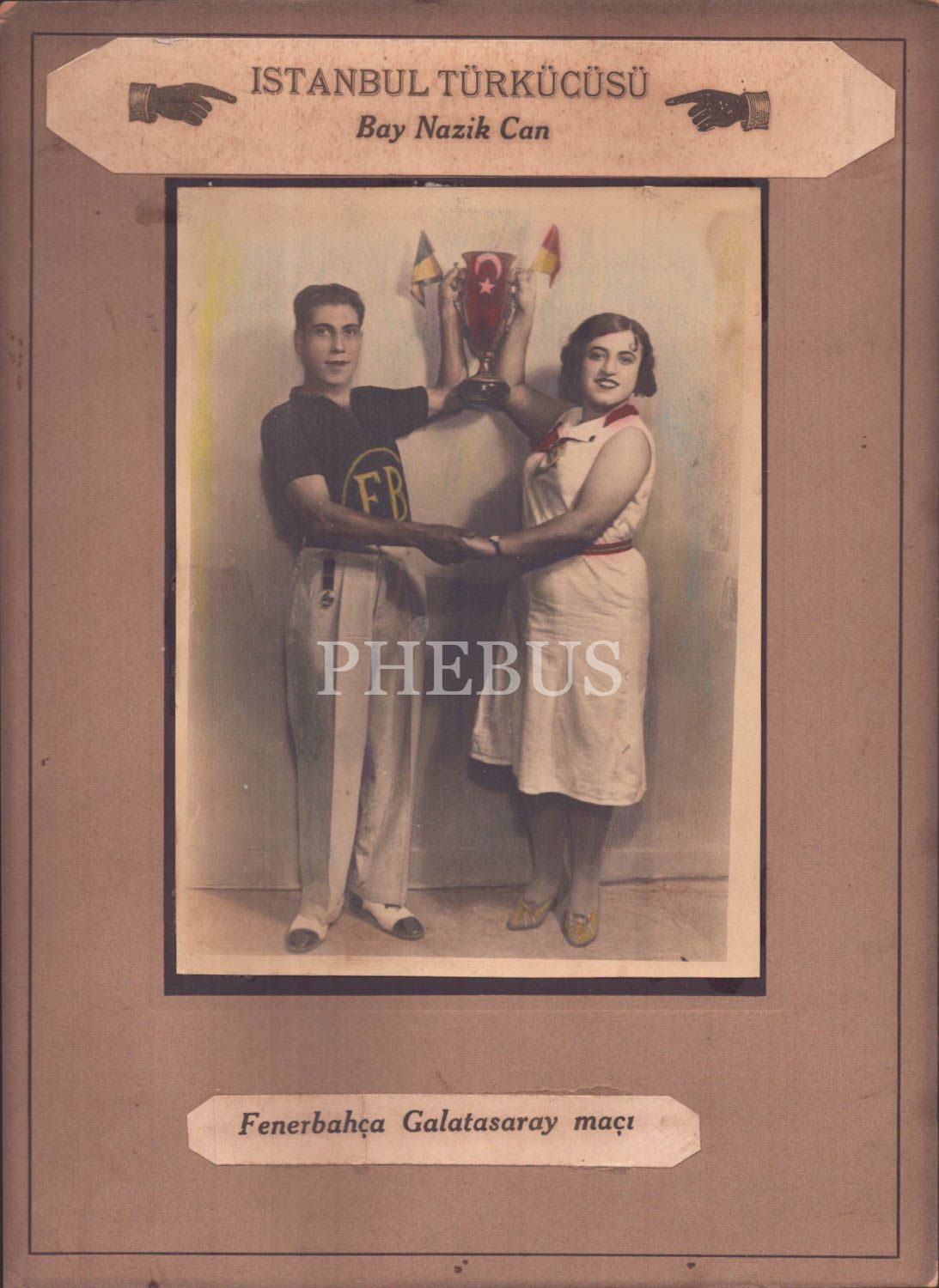 "İstanbul Türkücüsü" Bay Nazik Can tarafından hazırlanmış mizansenle "Fenerbahçe - Galatasaray maçı" konulu amatör fotoğraf, elle renklendirilmiş, paspartu 28x38 cm, fotoğraf 17x23 cm...