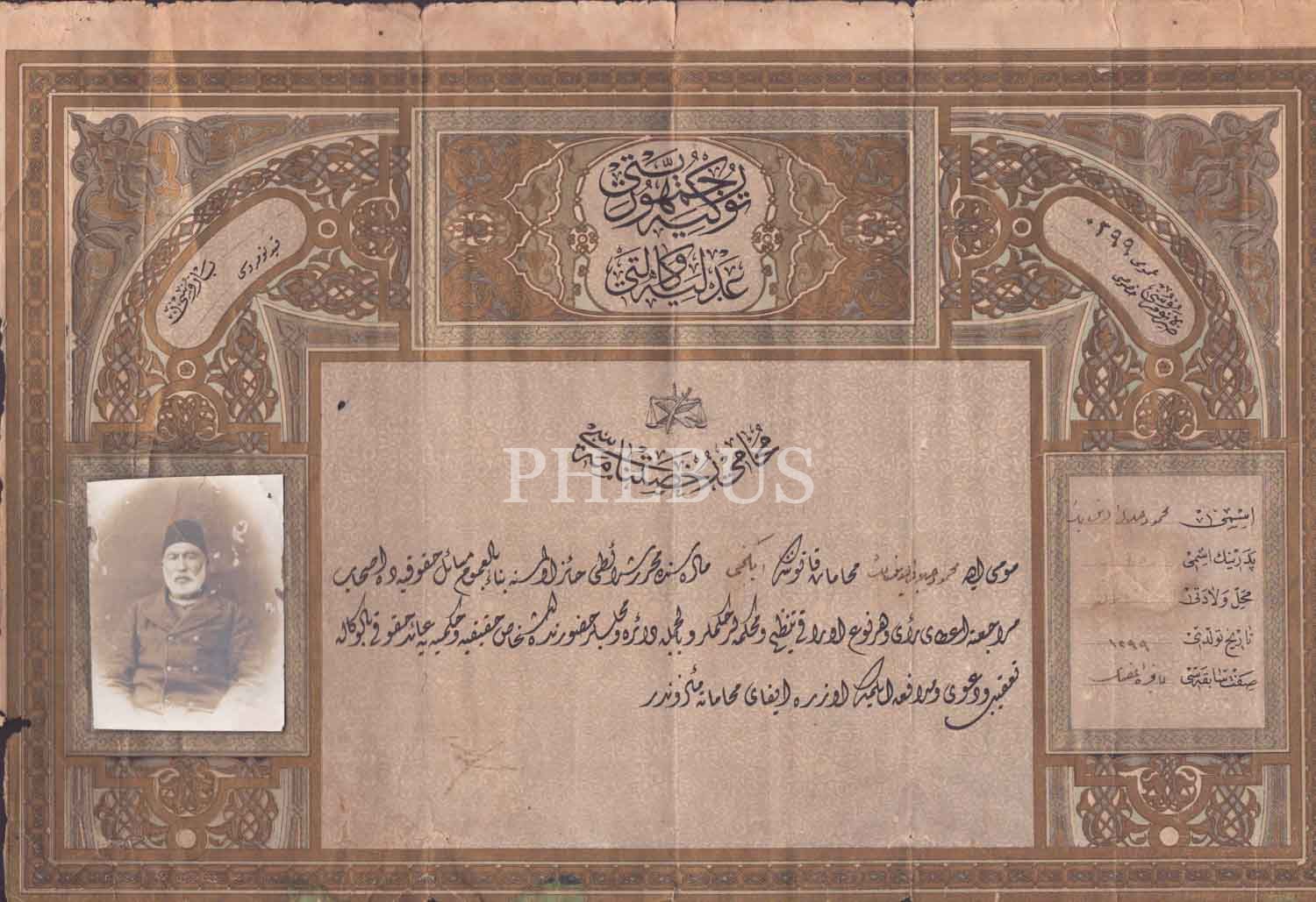 Türkiye Cumhuriyeti Adliye Vekaleti Muhami (Avukat) Ruhsatnamesi antetli fotoğraflı, Osmanlıca avukatlık belgesi, 43x29 cm...