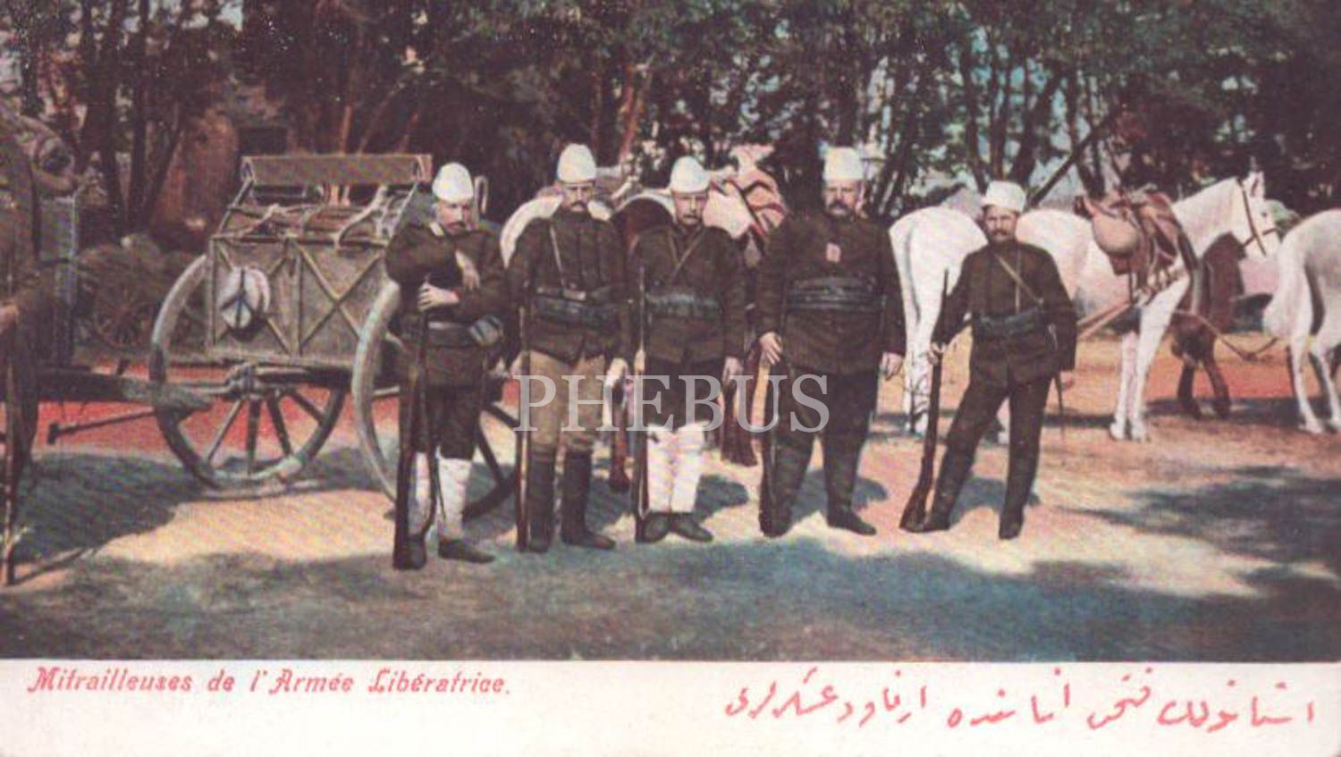 Üniformaları ve tüfekli Osmanlı askerleri, "Mitrailleuses de l´ Armee Liberatrice", Osmanlıca "İstanbul´un Fatihi İnat´da Arnavut askerleri" yazılı, ed.: M. J. C., 14x9 cm...