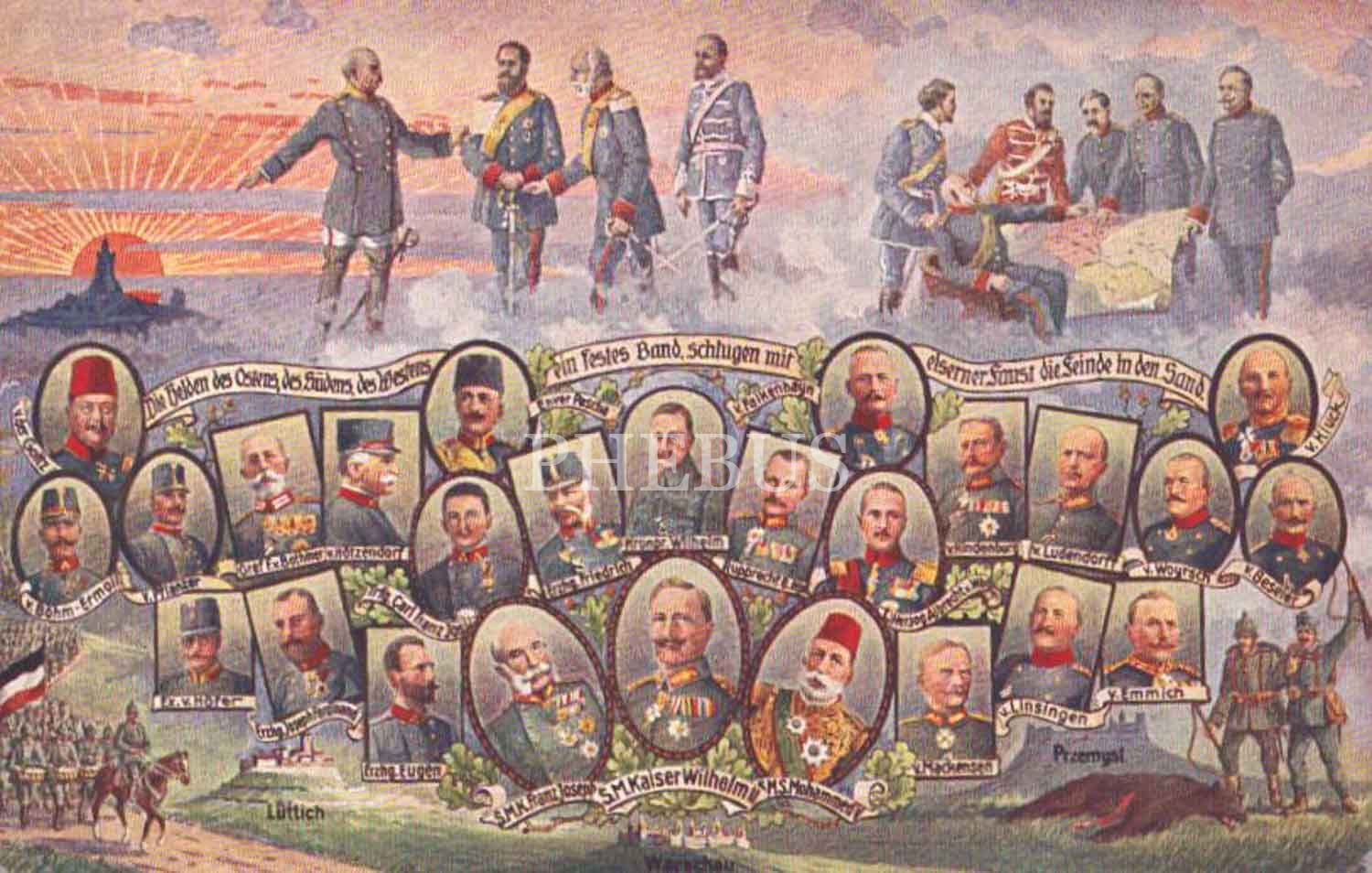 1. Dünya Savaşı İttifak Devletleri liderleri ve önemli subayların görselleri, ed.: A. Kosel, Lugan, Sa., Gen v. Kgl. S. Ministerium, postandan geçmiş, 14x9 cm...