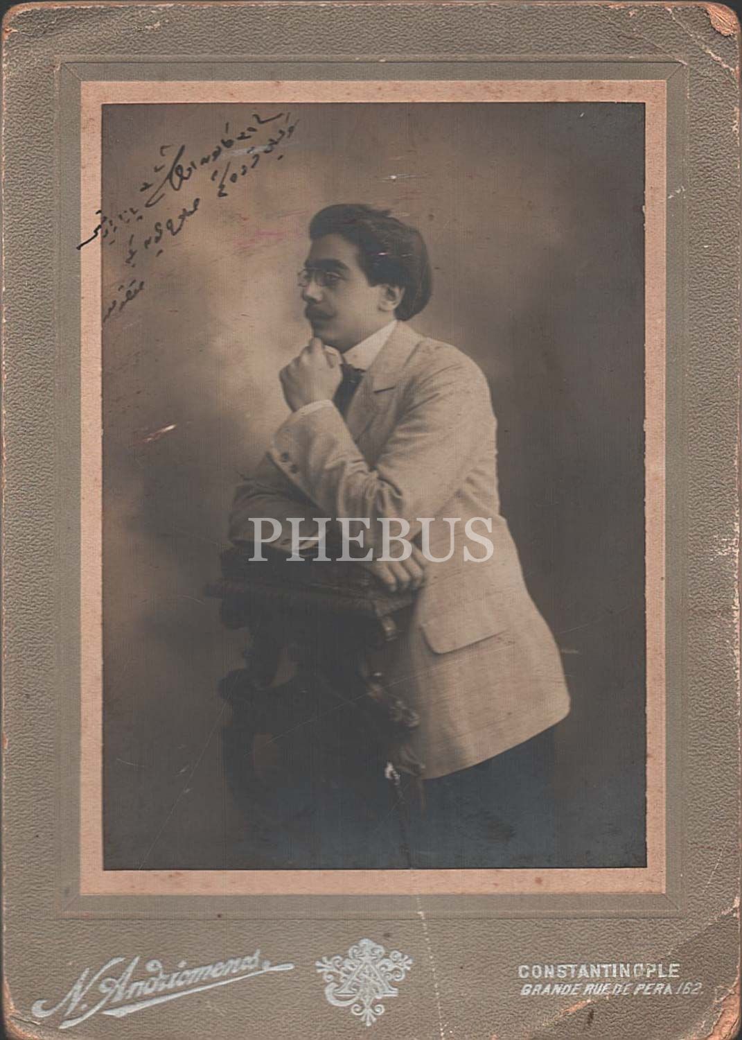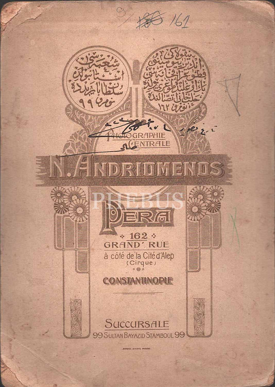Şık giyimli beyefendinin stüdyo hatıra kabin fotoğrafı, Nicolas Andriomenos Fotoğrafhanesi, Grand Rue de Pera, Constantinople, 13x19 cm...