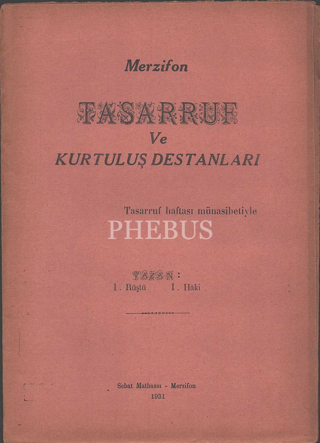 Tasarruf Haftası münasebetiyle yayınlanan MERZİFON TASARRUF VE KURTULUŞ DESTANLARI, yazan: İ. Rüştü & İ. Hâki, 1931, Sebat Matbaası, Merzifon, 10 sayfa, 17x24 cm...