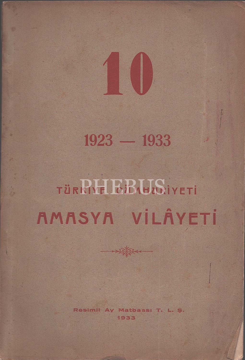 Cumhuriyet´in onuncu yıl dönümünde yayınlanan ve on yıllık bu süre zarfında Amasya ilinde meydana gelen sağlık, eğitim, imar vd. gelişmeleri aktaran kitap: TÜRKİYE CÜMHURİYETİ AMASYA VİLÂYETİ (1923-1933), Resimli Ay Matbaası, 1933, 38 sayfa metin + görseller, 17x24 cm...
