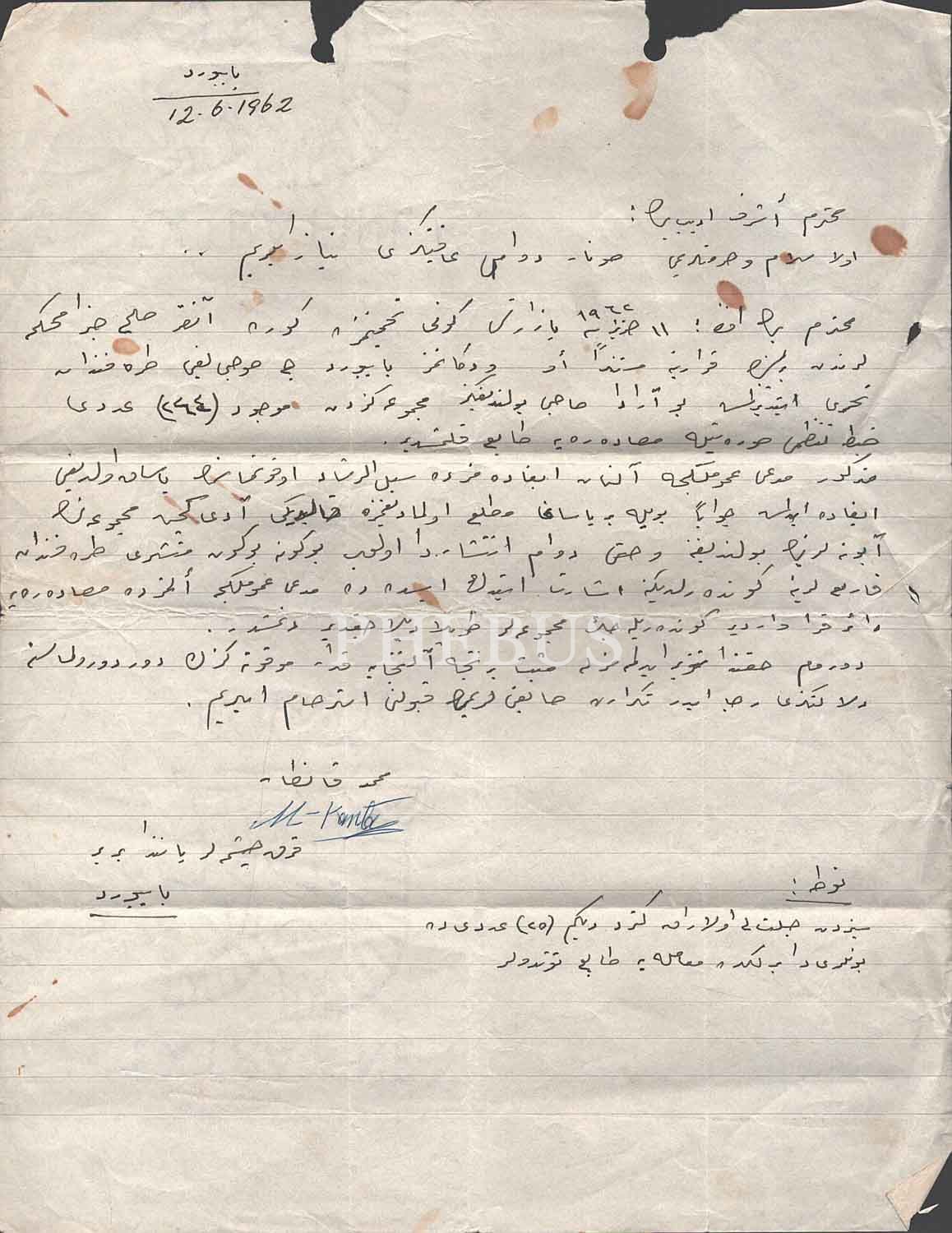 Mehmet Kantar imzalı Sulh Ceza Mahkemesi´nin Eşref Edip´e ait mecmuaları toplattığının haberini veren Eşref Edip´e yazılmış Osmanlıca mektup, 12 Haziran 1962, 23x30 cm...