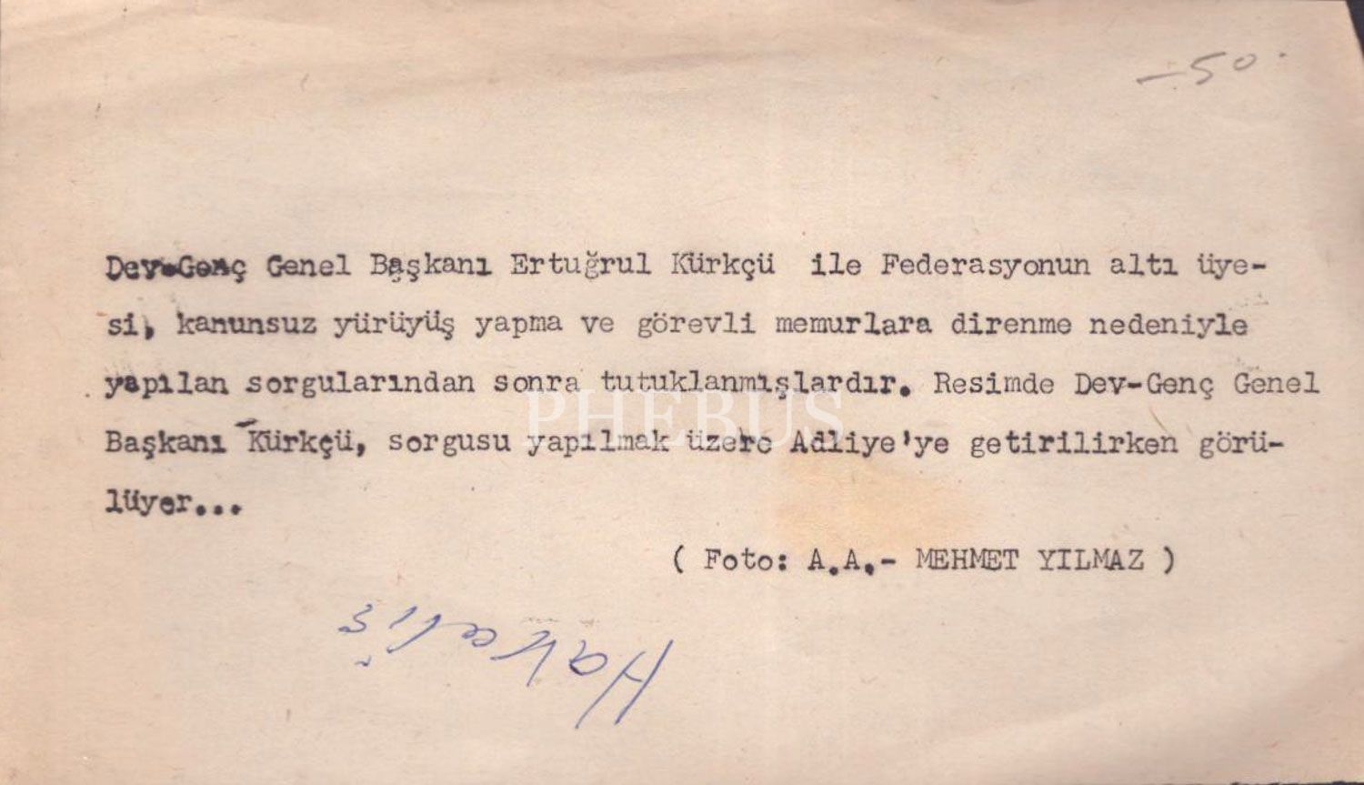 Dev-Genç Genel Başkanı Ertuğrul Kürkçü´yü adliyeye getirilirken gösteren basın fotoğrafı, 12x18 cm...
