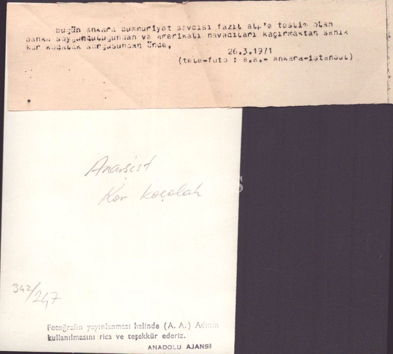 Banka soygunculuğundan ve Amerikalı havacıları kaçırmaktan aranan anarşist Kor Koçalak´ı teslim olduktan sonra gösteren basın fotoğrafı, 12x18 cm...