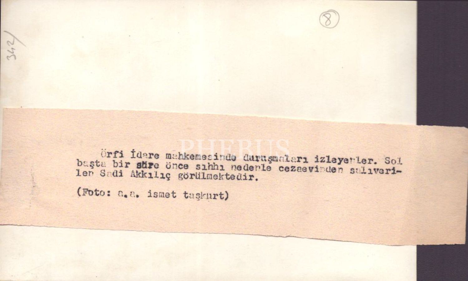 Örfi İdare mahkemesinde duruşmaları seyredenleri gösteren basın fotoğrafı (sol başta Sadi Akkılıç görülmekte), 18x12 cm...