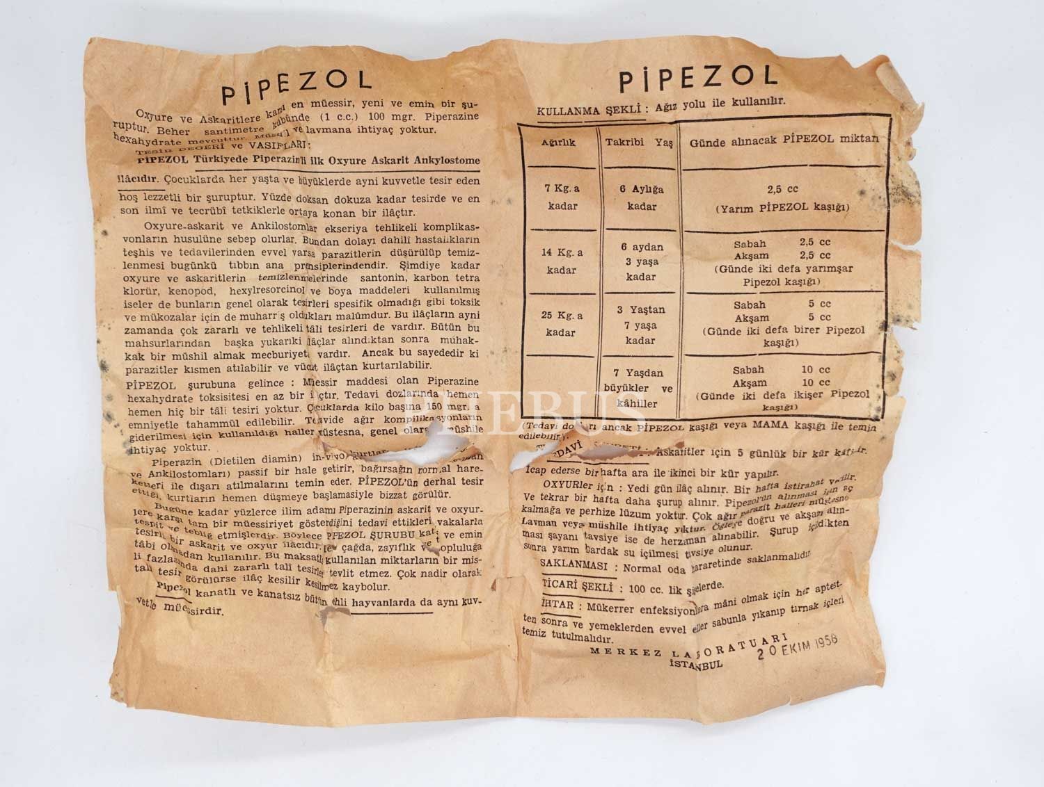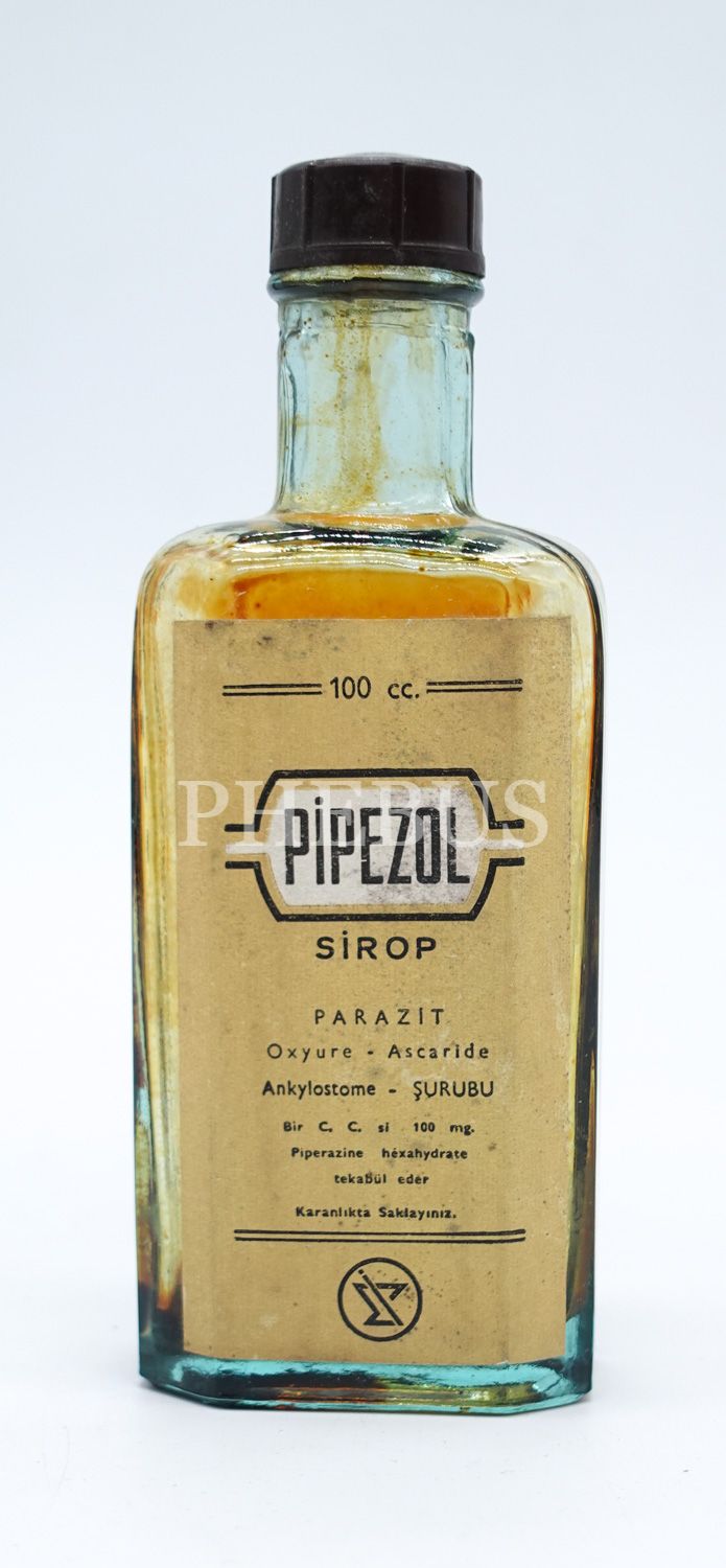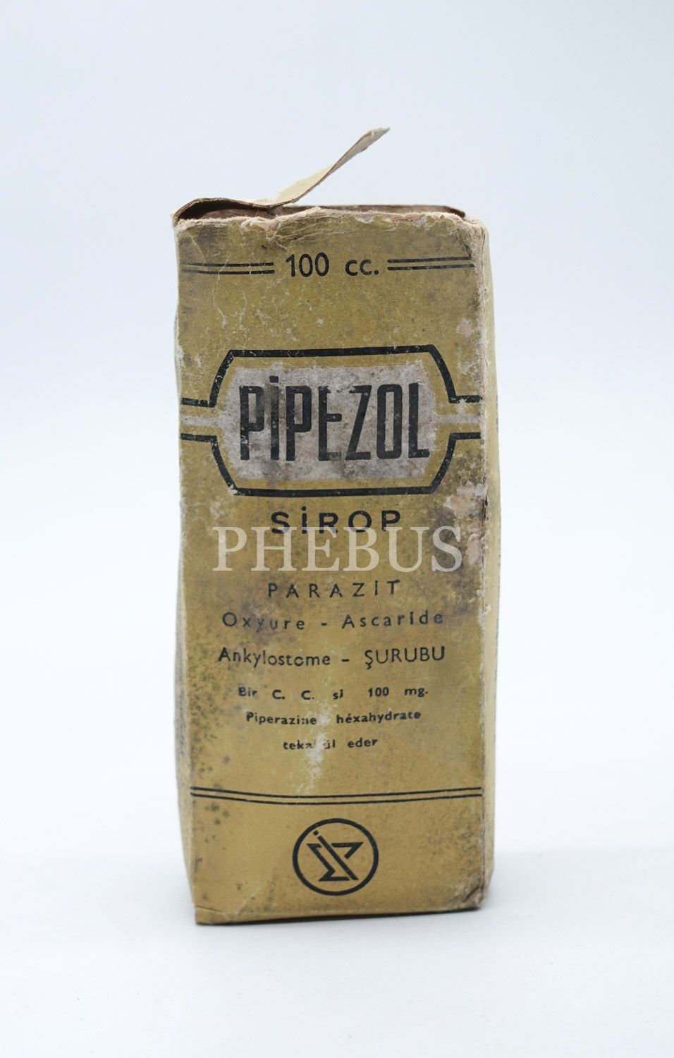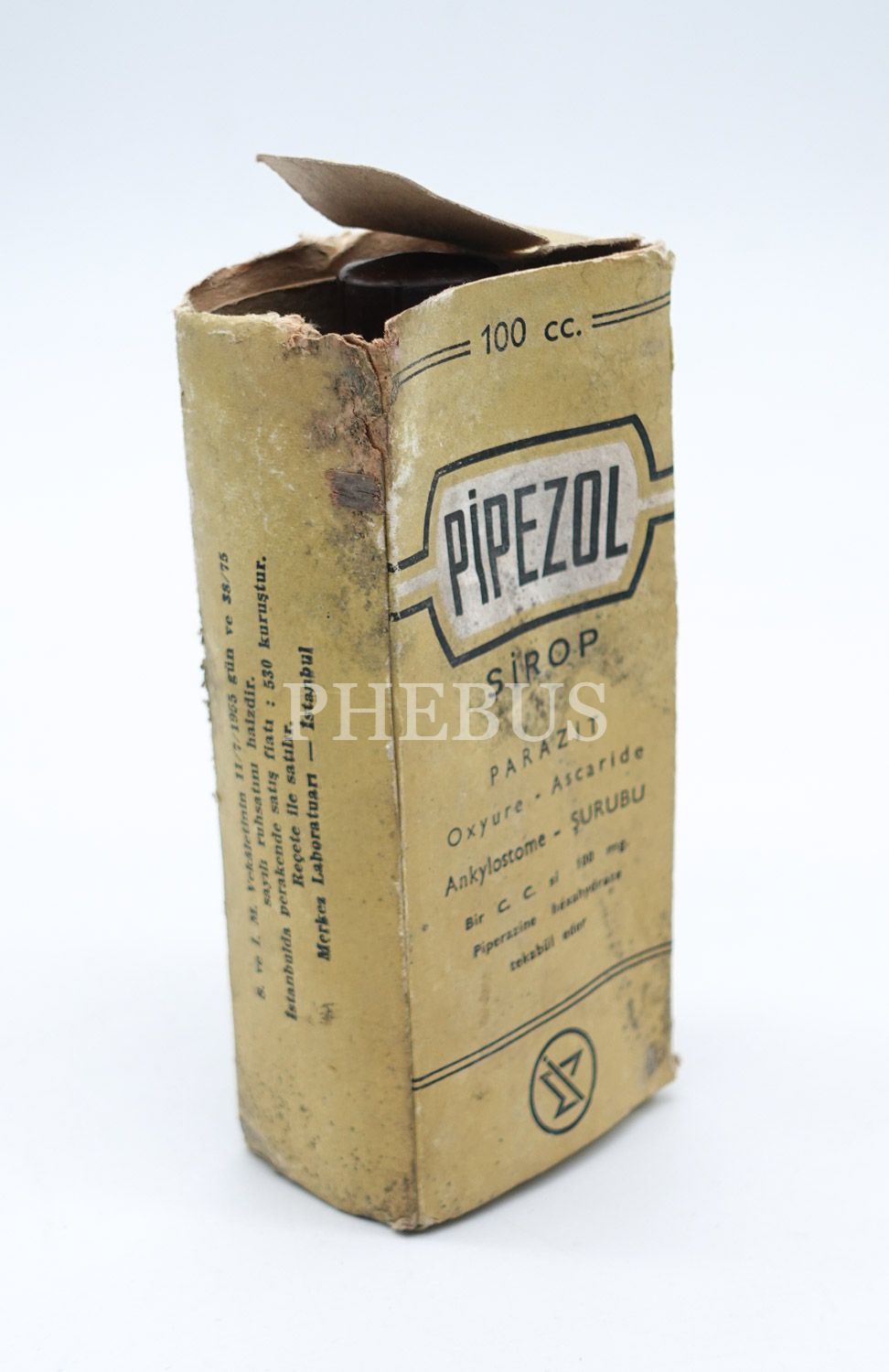 Prospektüsün de yer aldığı orijinal kutusunda Pipezol şurup şişesi, 14x5x3 cm...