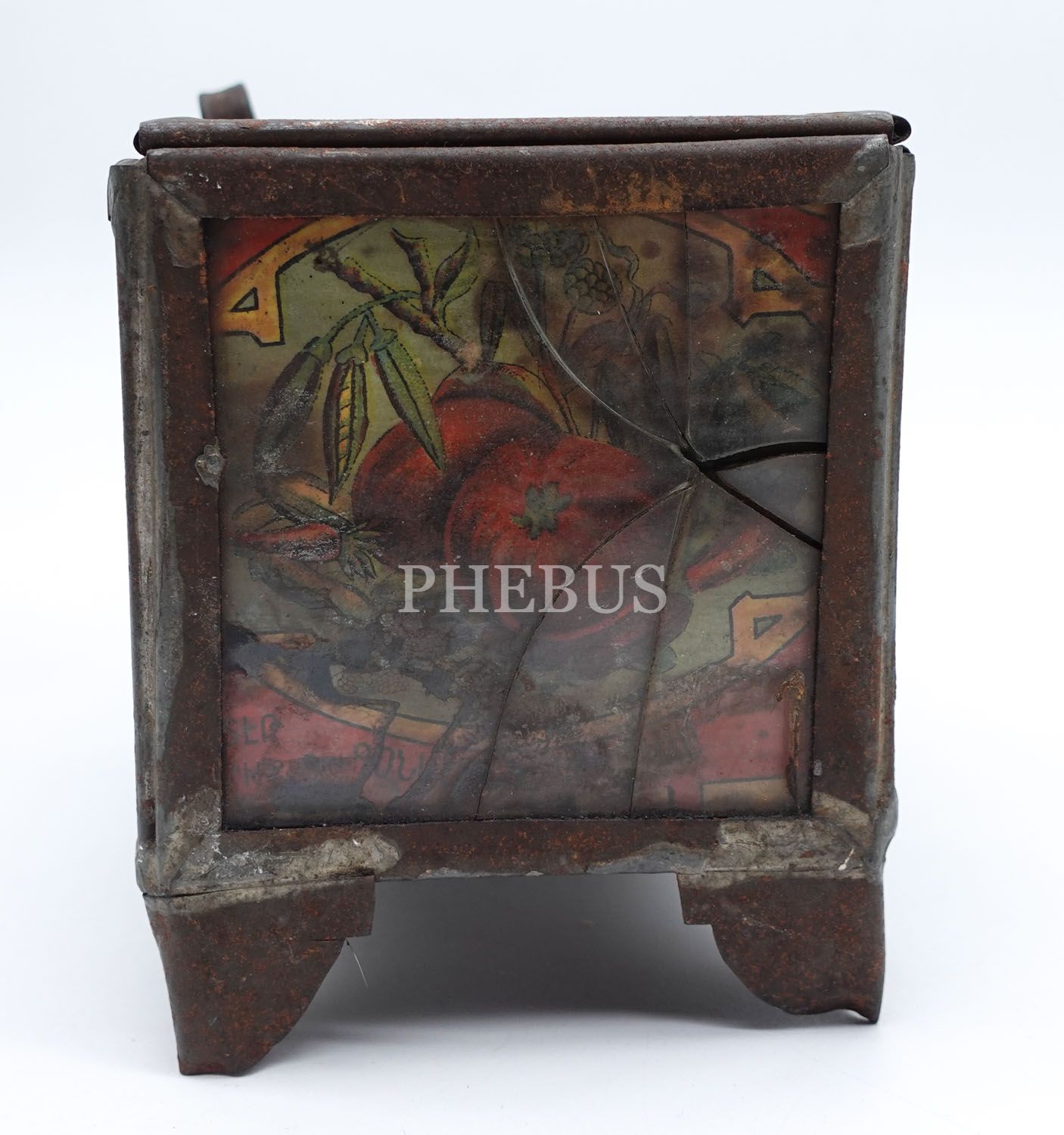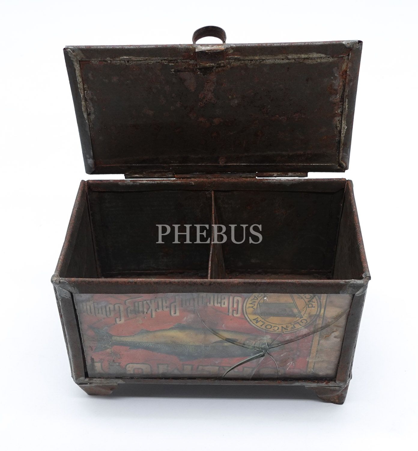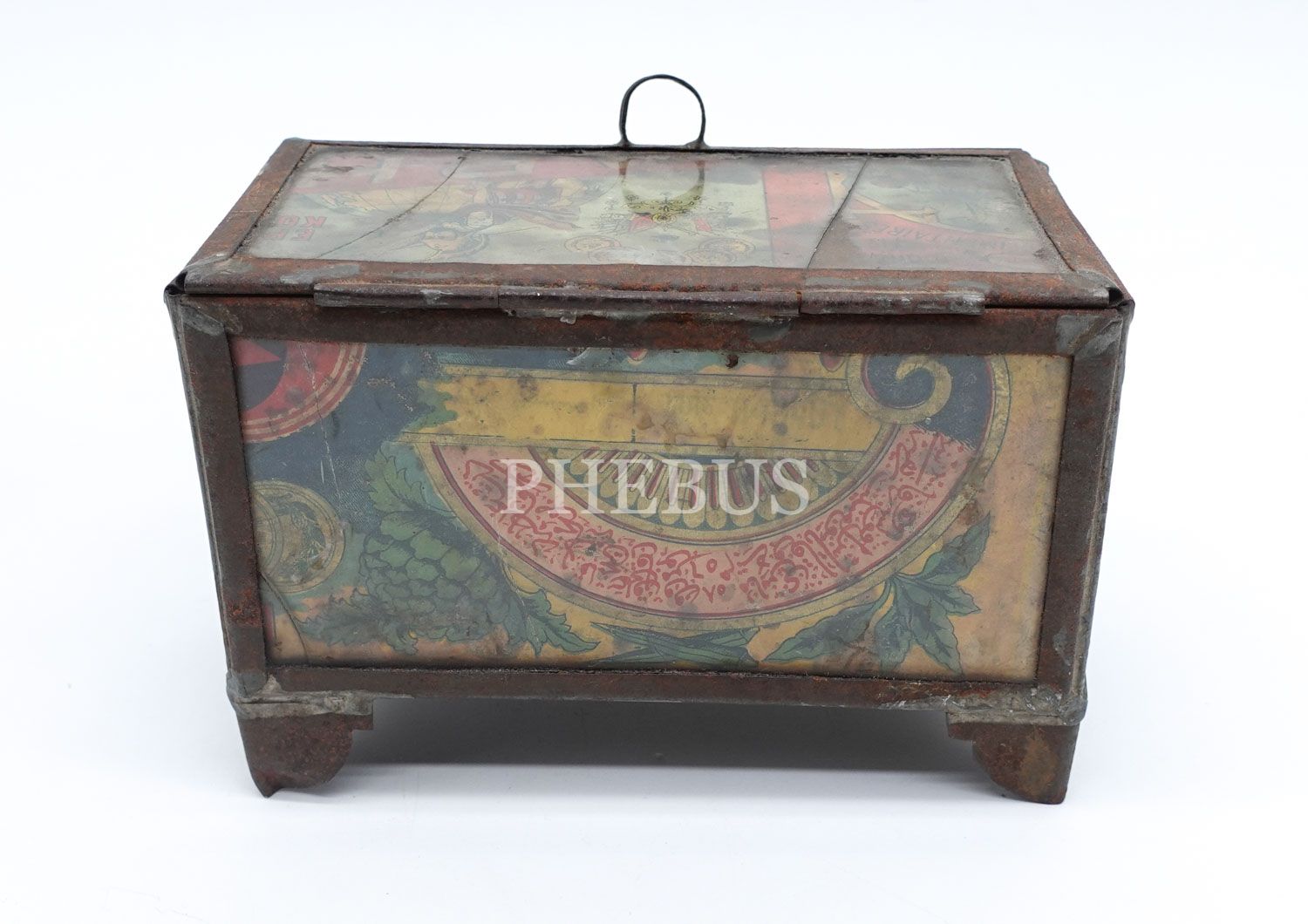 Osmanlıca-Fransızca-Ermenice Glencolm Packing Company (Constantinople) reklamlı ve Osmanlı devlet arması görselli, sandık formunda teneke kutu, 16x9x9 cm...