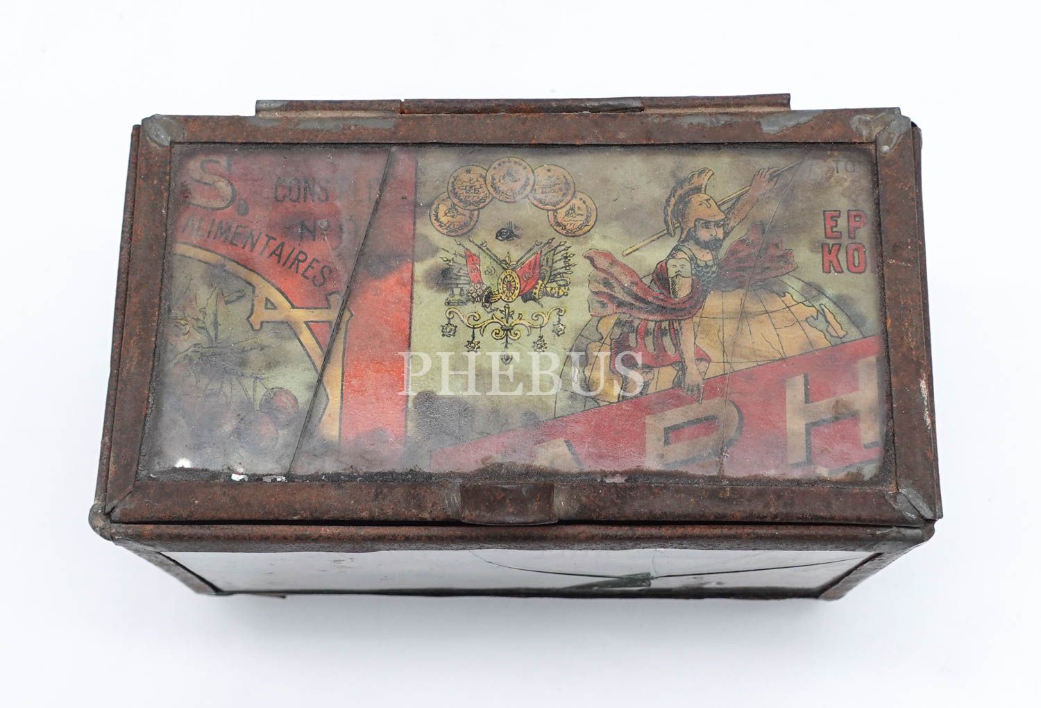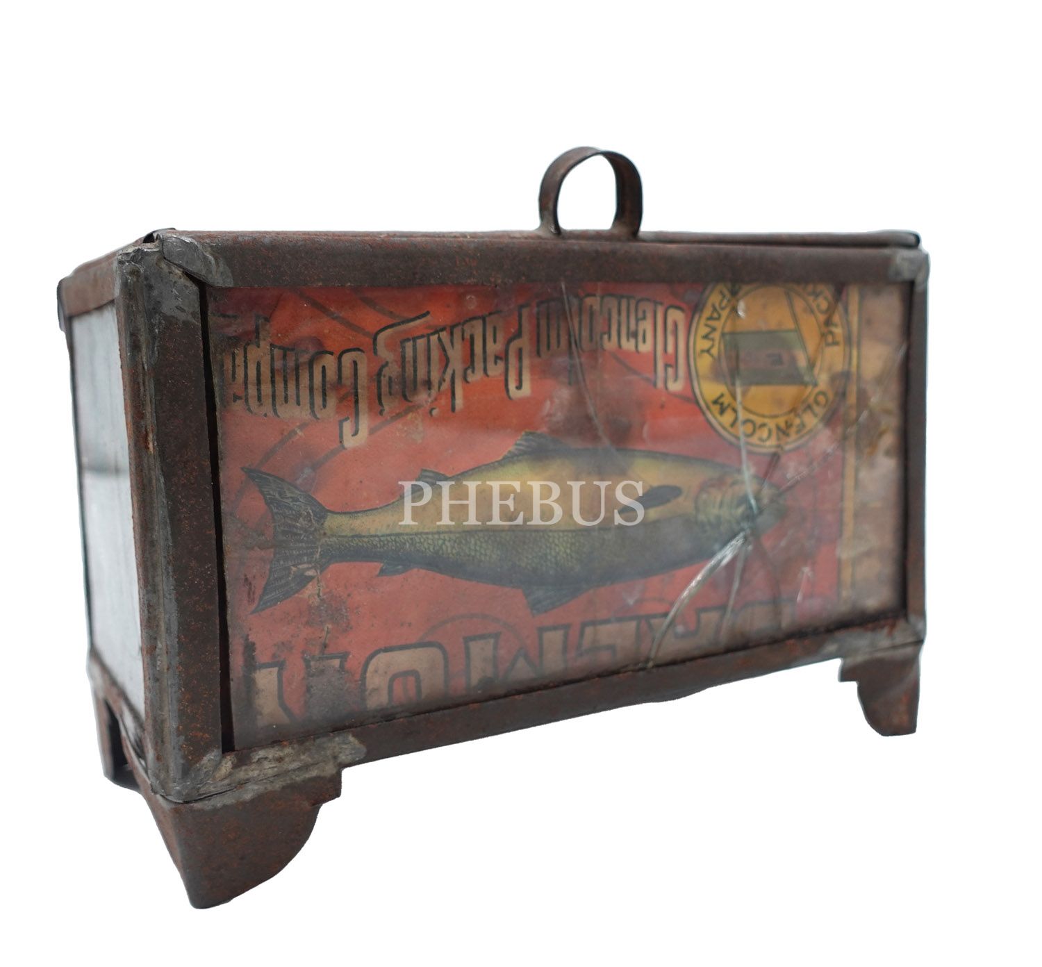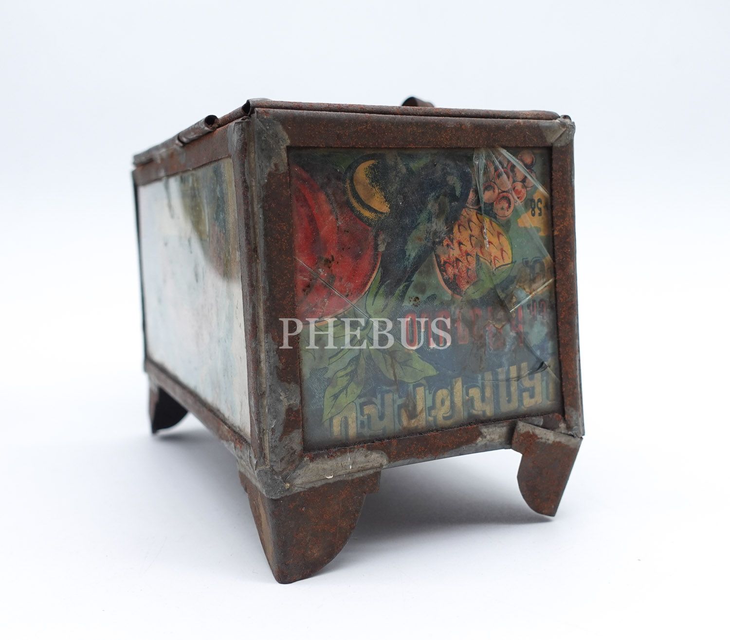 Osmanlıca-Fransızca-Ermenice Glencolm Packing Company (Constantinople) reklamlı ve Osmanlı devlet arması görselli, sandık formunda teneke kutu, 16x9x9 cm...