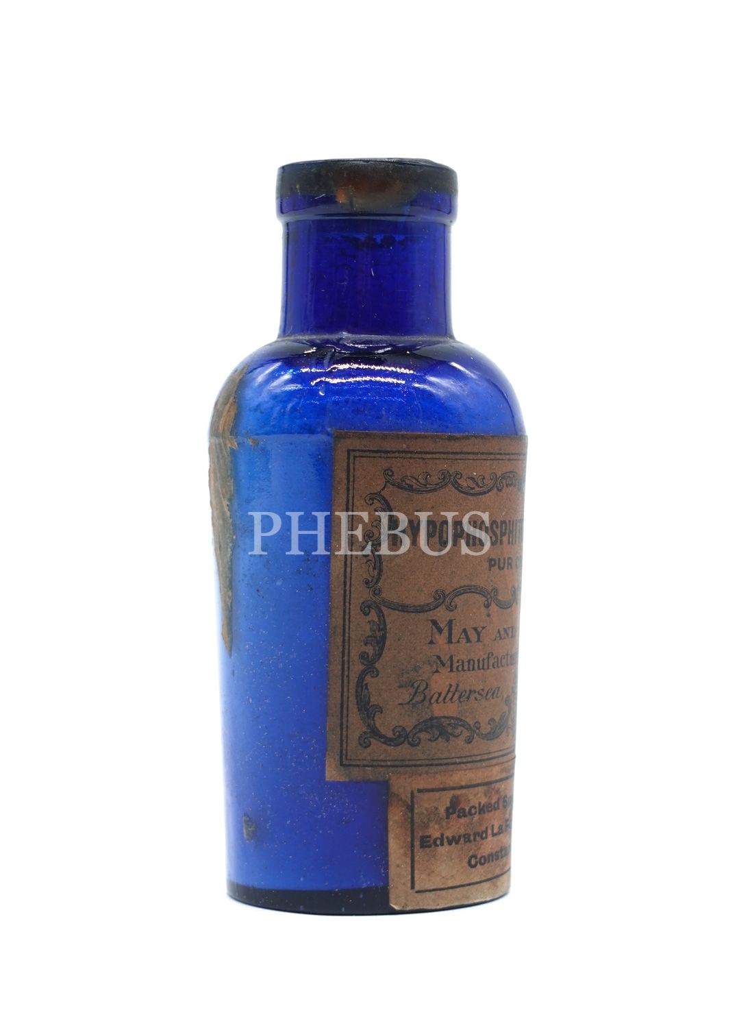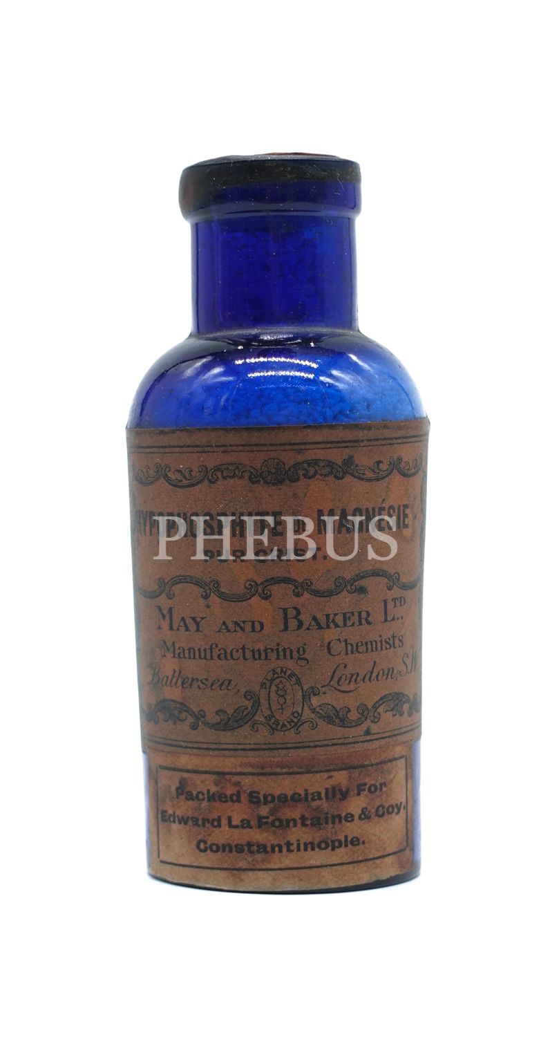 May and Baker Ltd. (Londra) üretimi magnezyum hipofosfit şişesi (dolu), şişe üzerinde Constantinople adresli ihracat etiketi yer almakta, 10x4 cm...