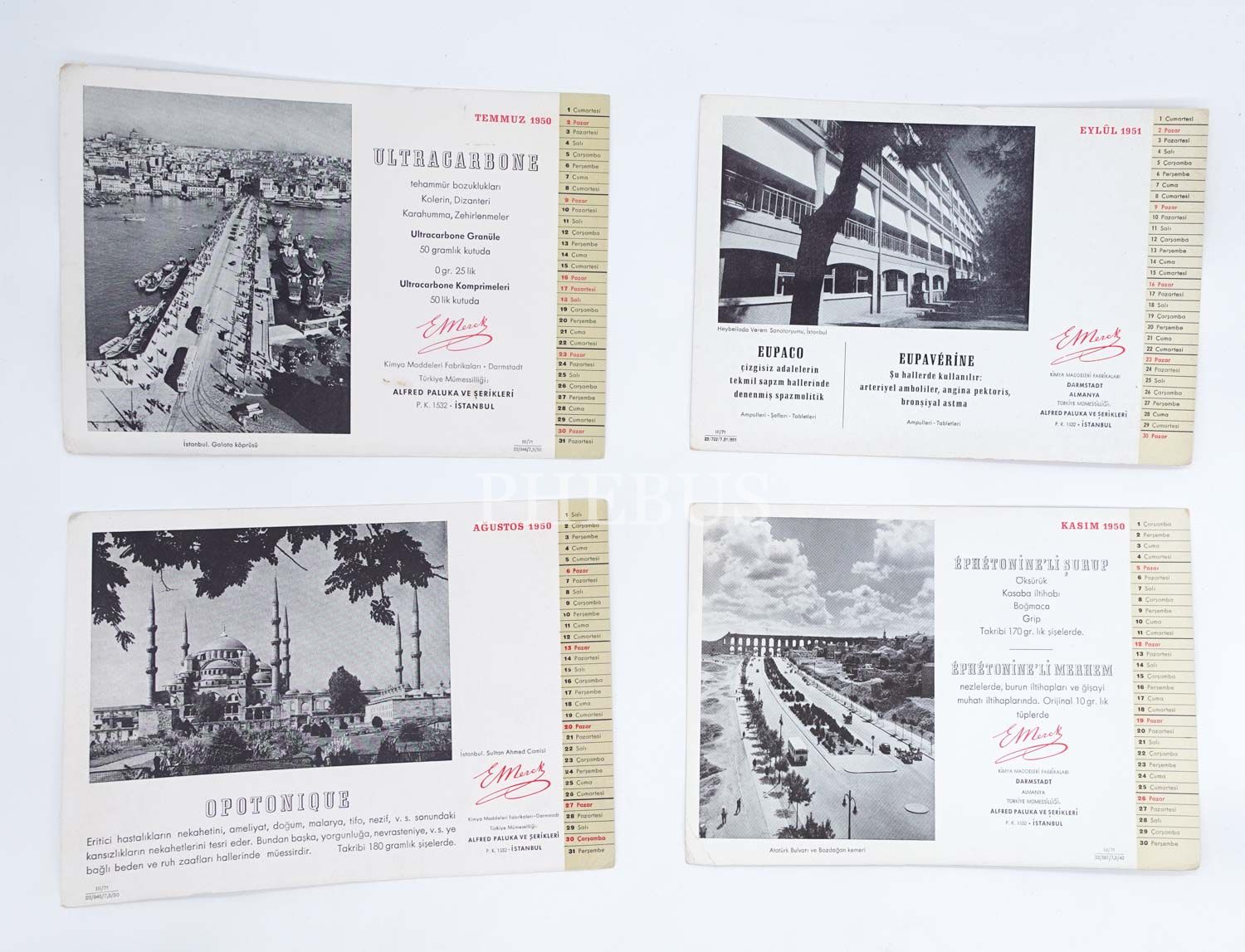 E. Merck Kimya Maddeleri Fabrikaları (Almanya) tarafından Türkiye pazarına sunulan ilaçların reklamlarını ihtiva eden takvimli ve İstanbul görselli kurutma kağıtları (4 adet, 1950-51 yılları), 21x15 cm...