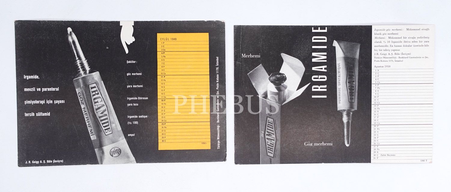 J. R. Geigy A. Ş. (İsviçre) tarafınfan Türkiye pazarına sunulan Irgamide merheminin reklamını ihtiva eden takvimli kurutma kağıtları (2 adet, 1949-50 yılları), 20x14 cm...