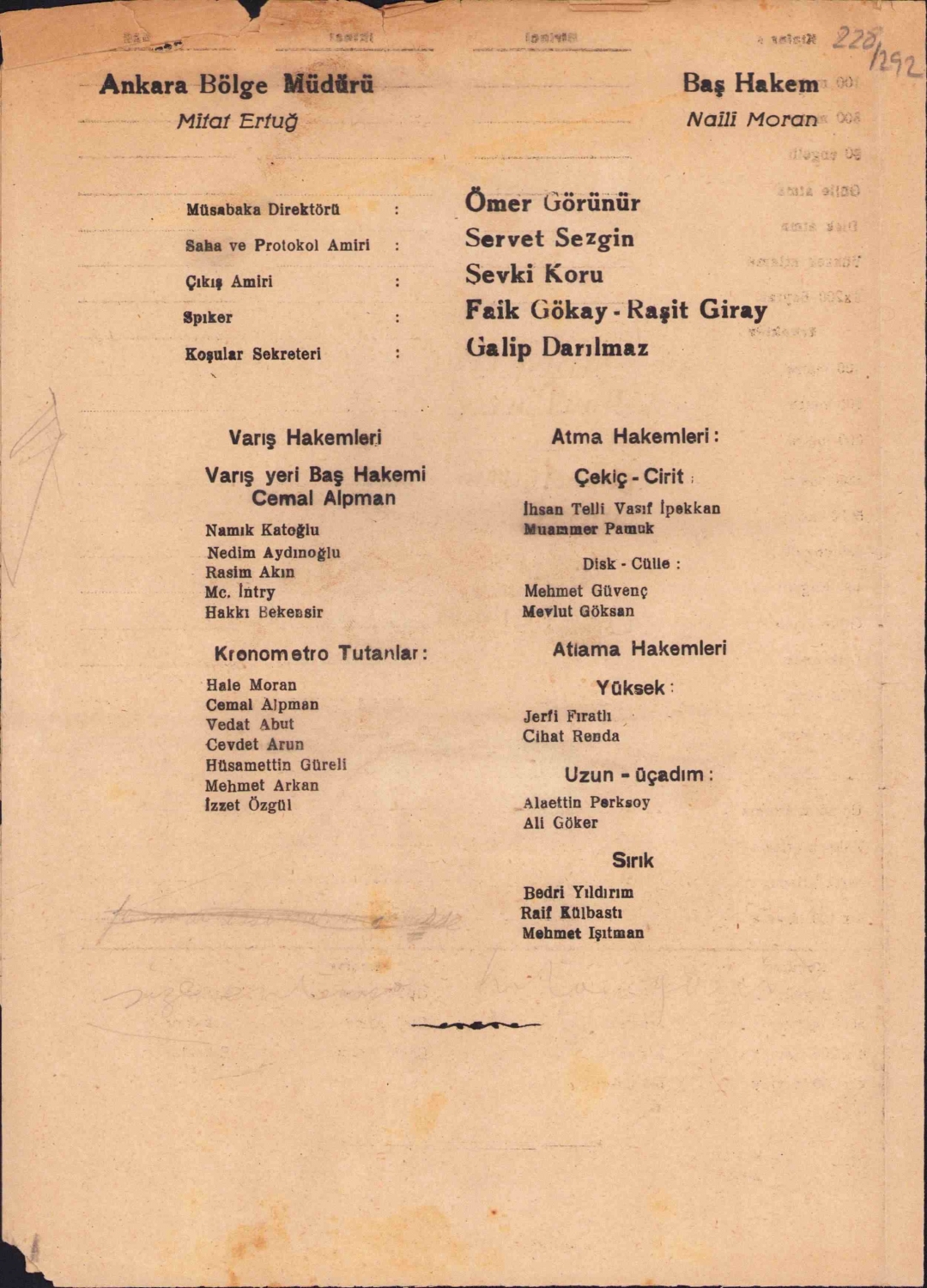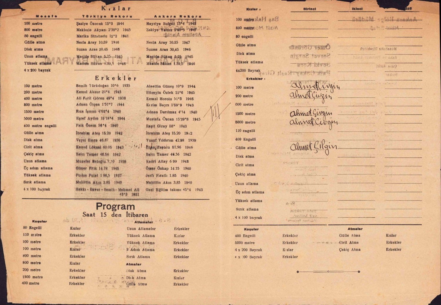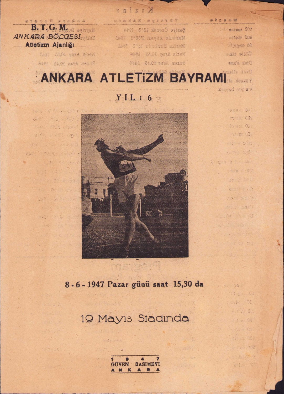 Ankara Atletizm Bayramı programı, 19 Mayıs Stadında, Ankara, 1947, 4 sayfa, 20x28 cm