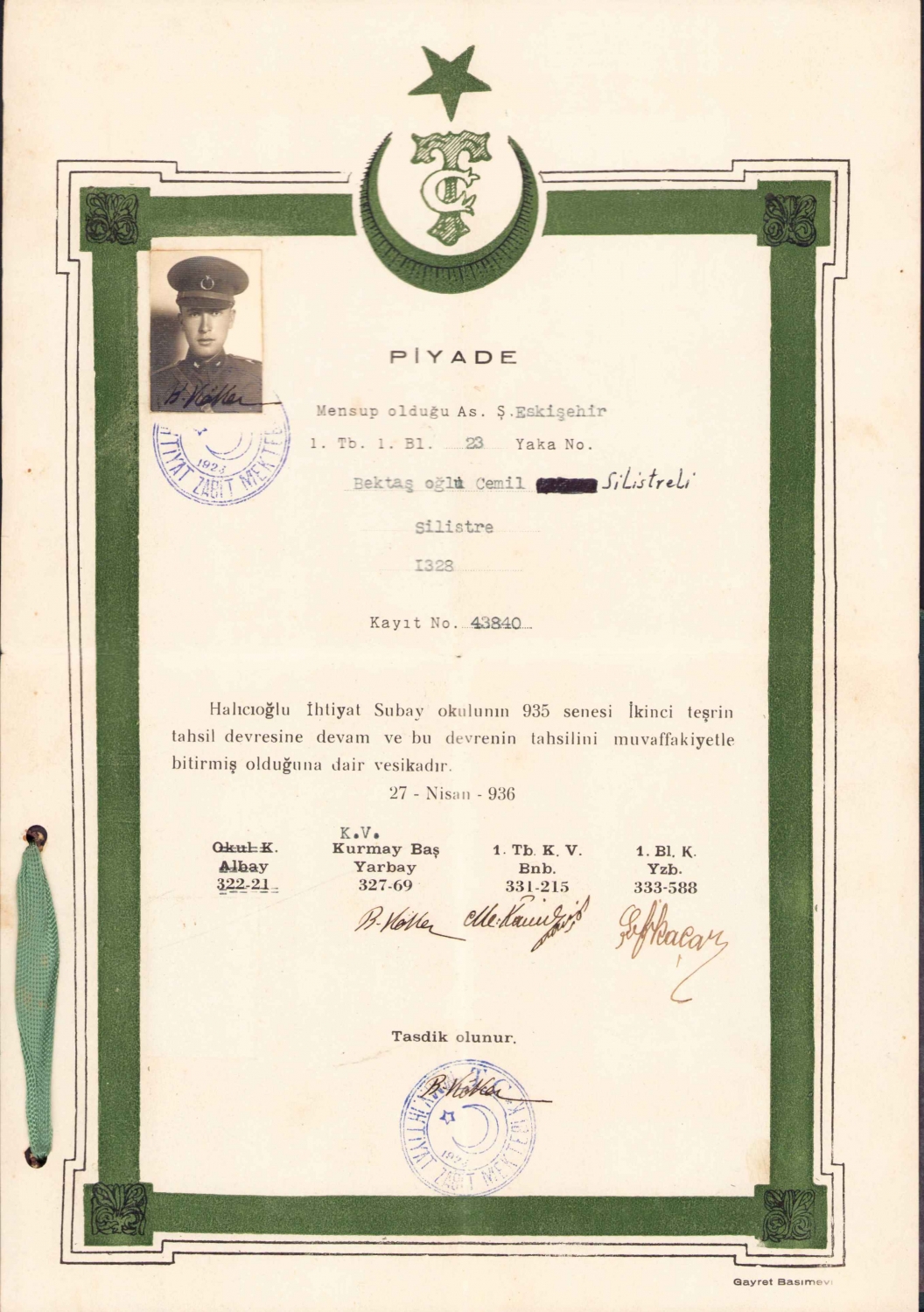 Halıcıoğlu İhtiyat Subay Okulu Piyade devre bitirme vesikası, 1935, orijinal kabında, 20x28 cm
